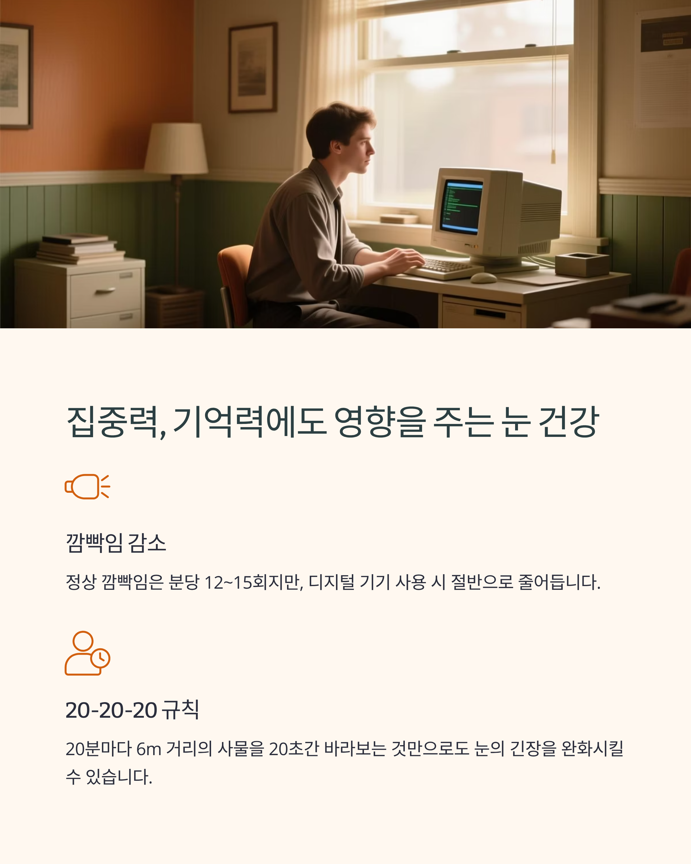 | 디지털 기기 사용 | 20-20-20 규칙 적용 | 안구 피로 완화, 시력 보호 |