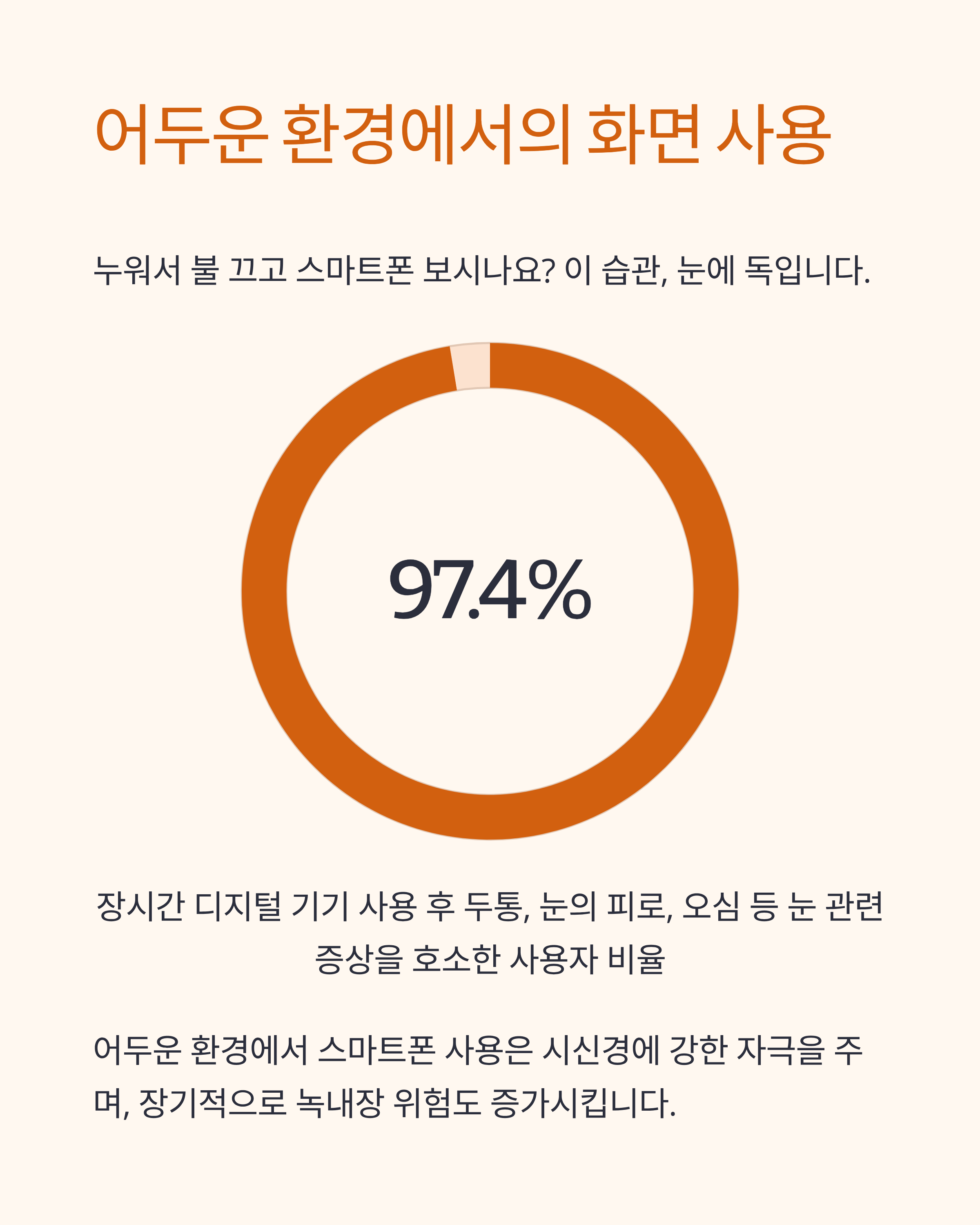 | 어두운 곳 화면 사용 | 녹내장, 두통, 피로감 | 사용자 97.4%가 증상 호소 |
