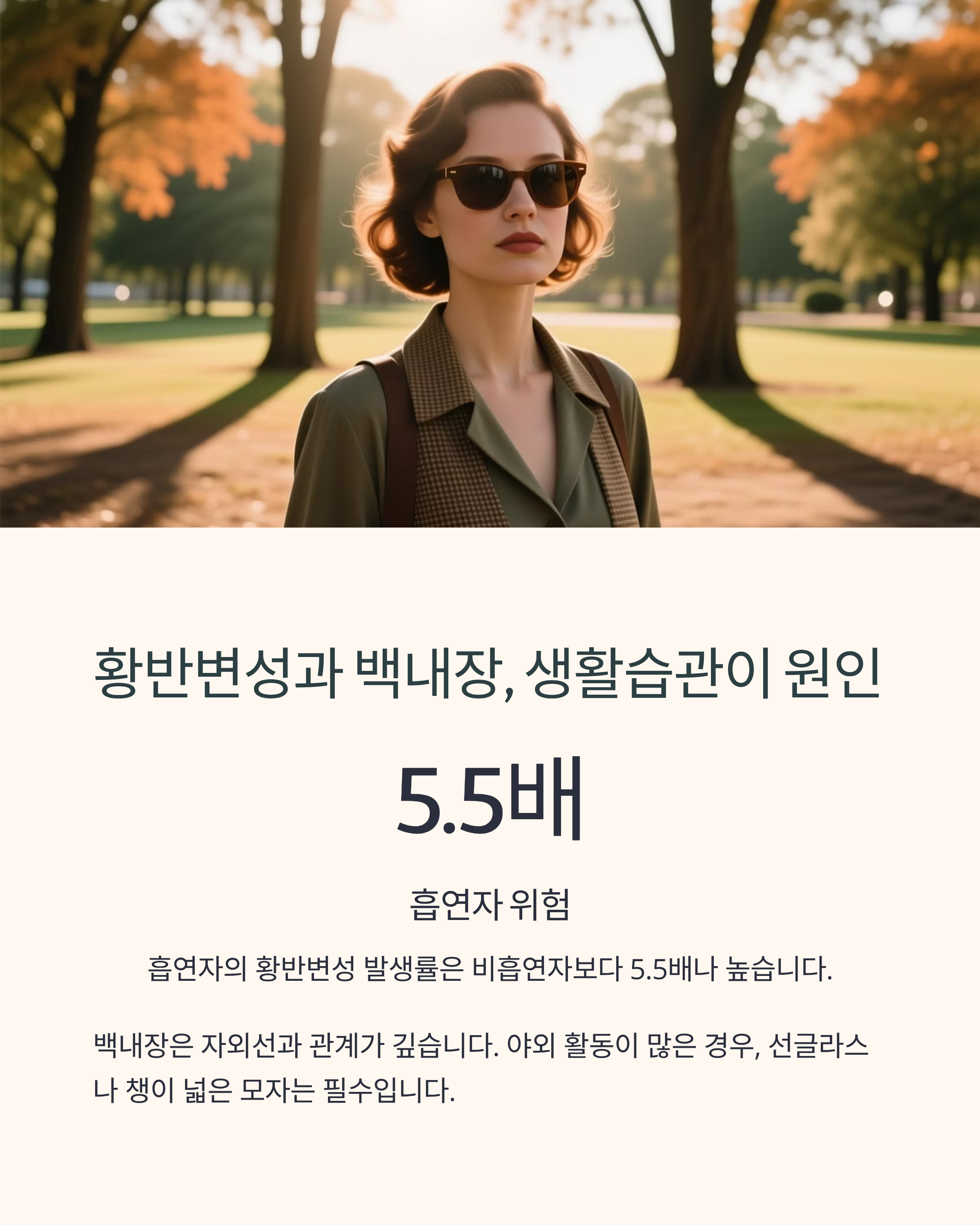 | 야외 활동 | 챙 넓은 모자, 선글라스 착용 | 자외선 차단, 백내장 예방 |