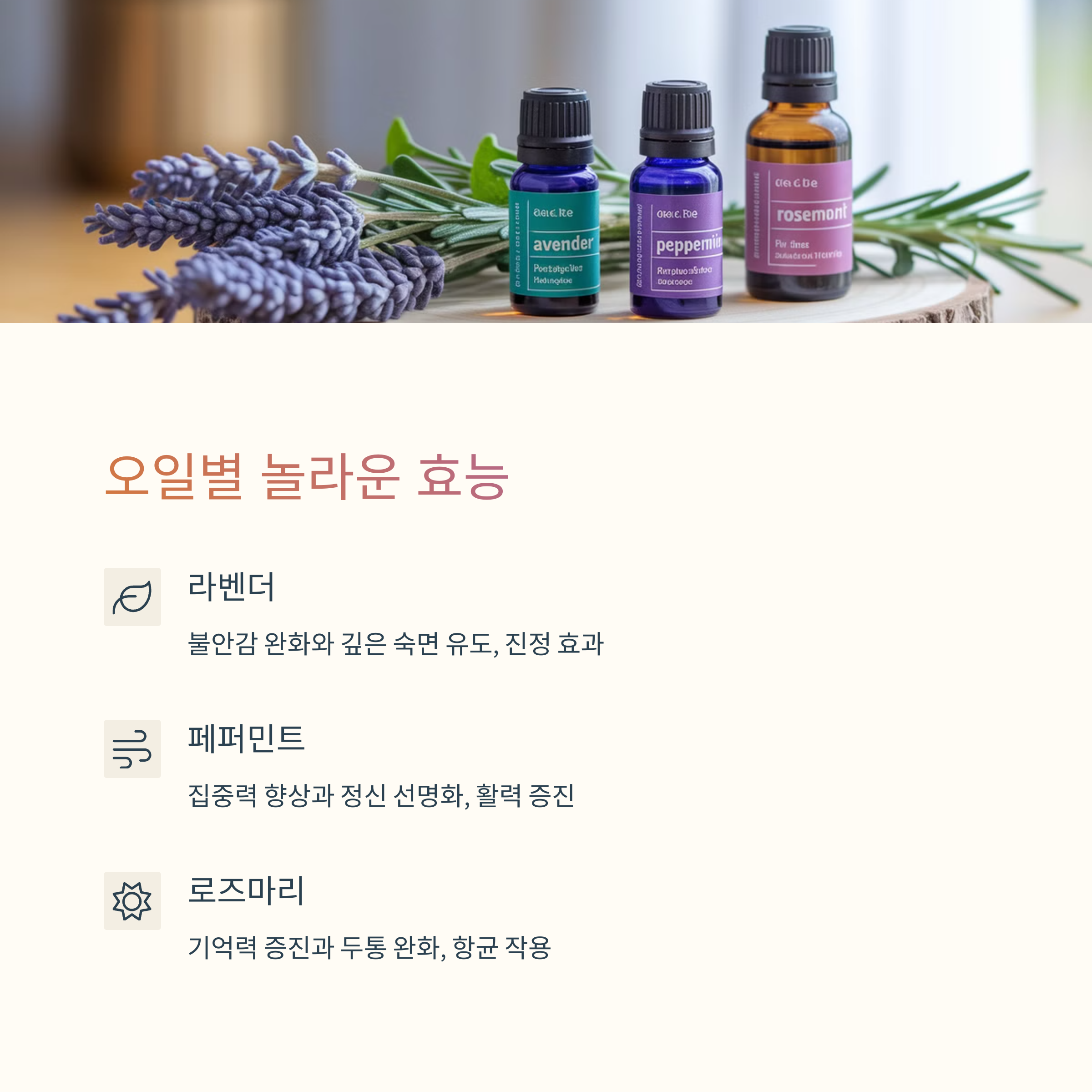 - 라벤더: 안정감과 숙면, 신경 진정 효과