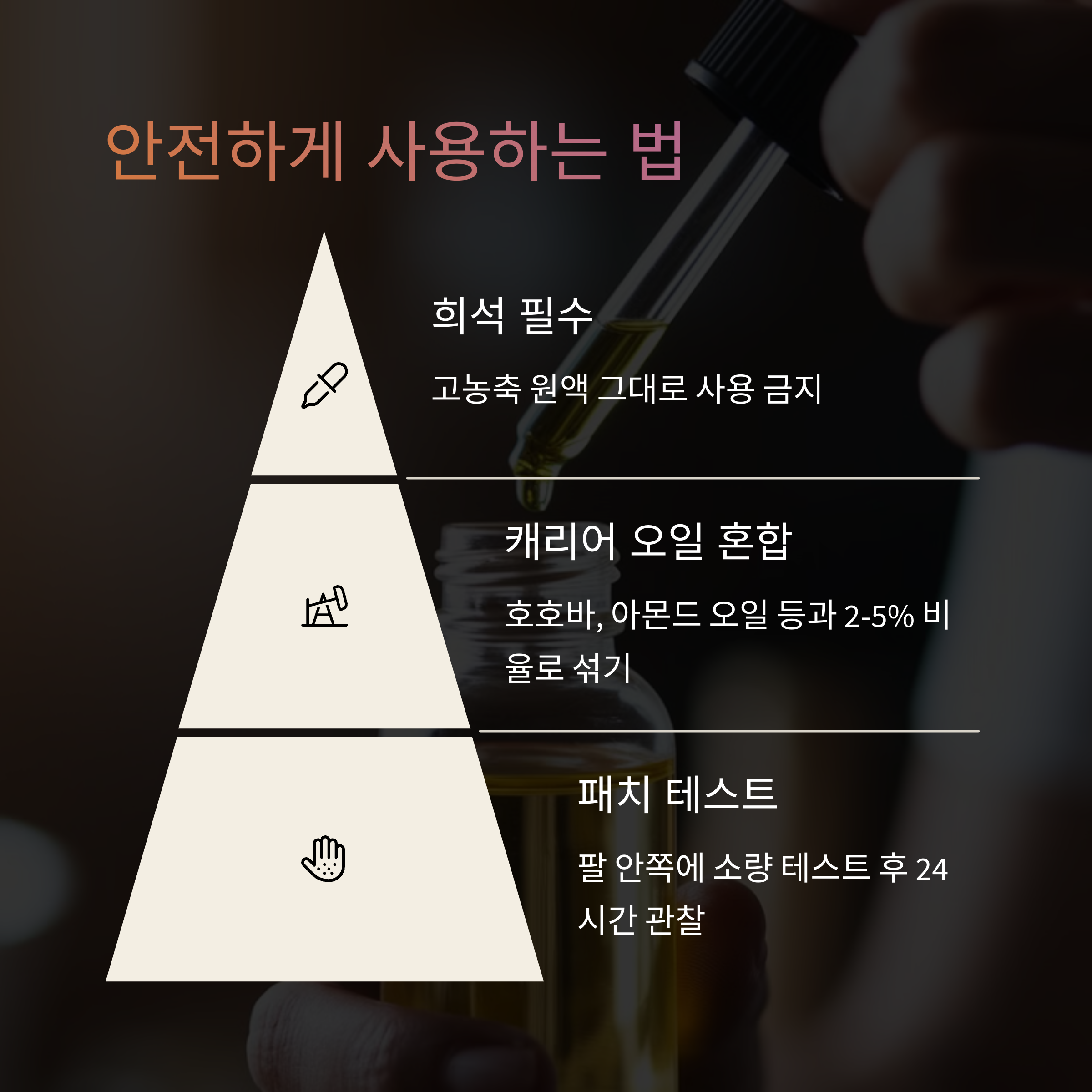 - 5% 농도 제한: 캐리어 오일과 반드시 섞어서 사용