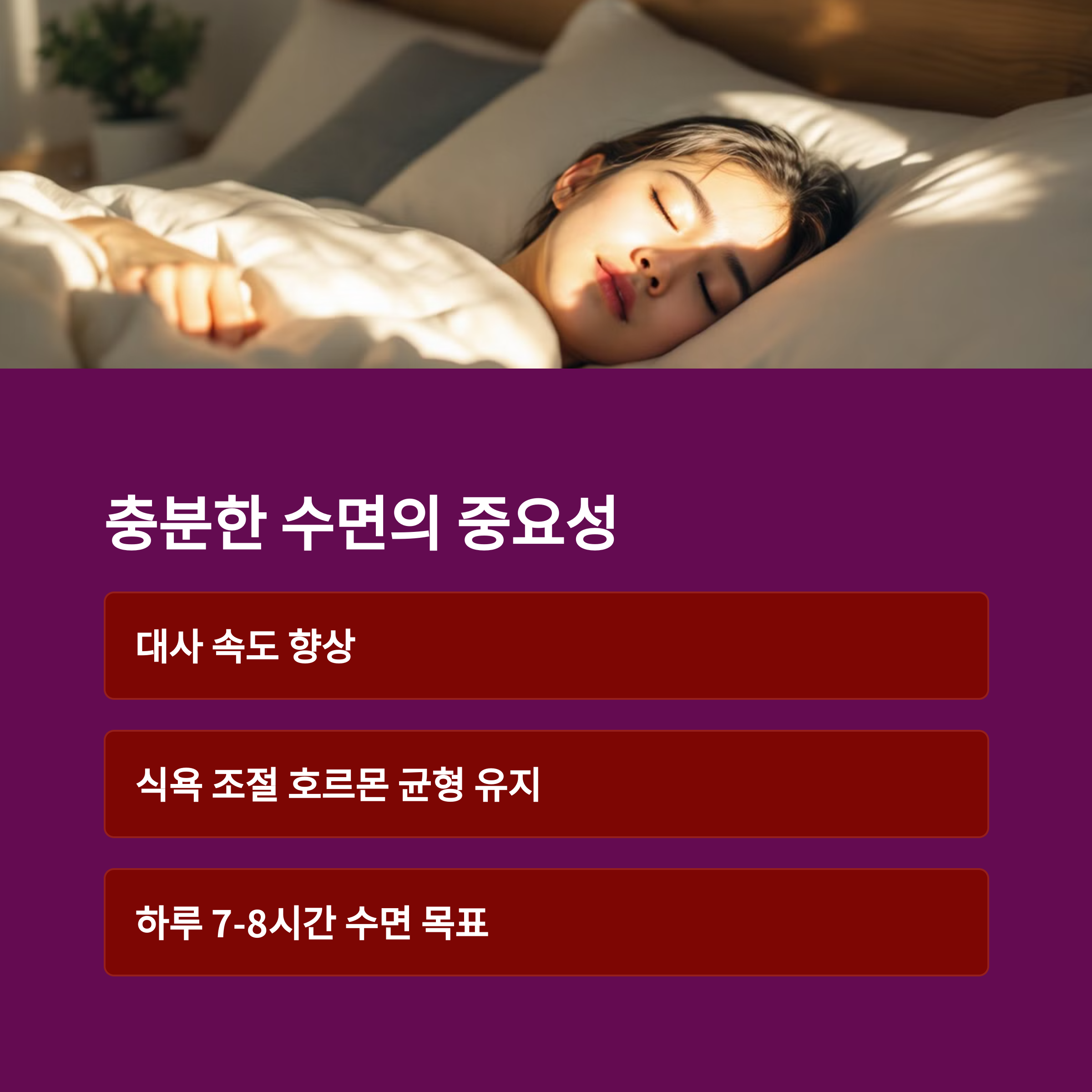 | 수면 | 충분한 수면은 신체 대사 속도를 개선하고, 체중 조절에 도움을 줍니다. 잘 자는 것만으로도 다이어트 효과를 볼 수 있습니다. |