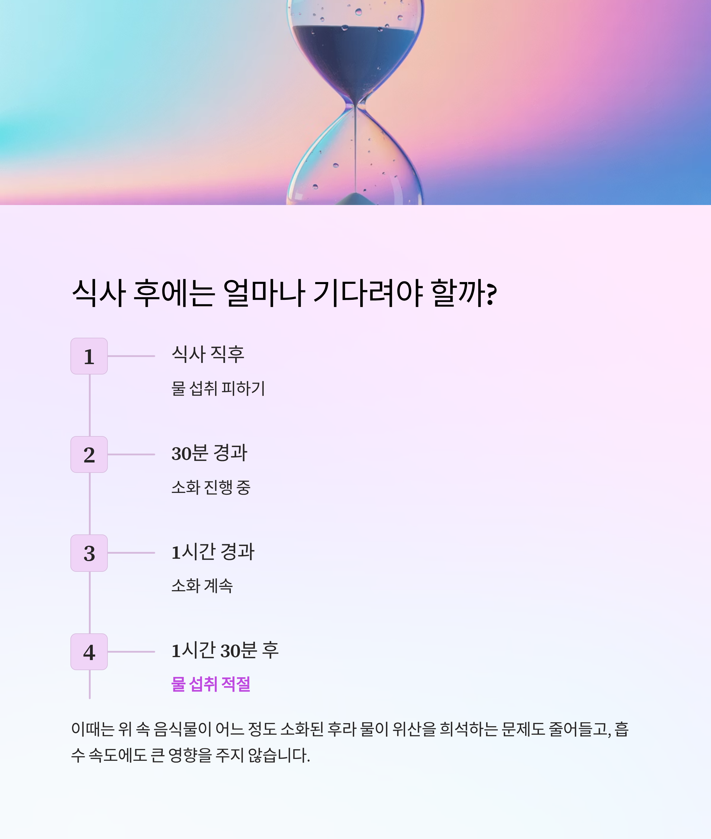 식사 1시간 30분 후 권장 소화 완료 후 수분 보충에 적합