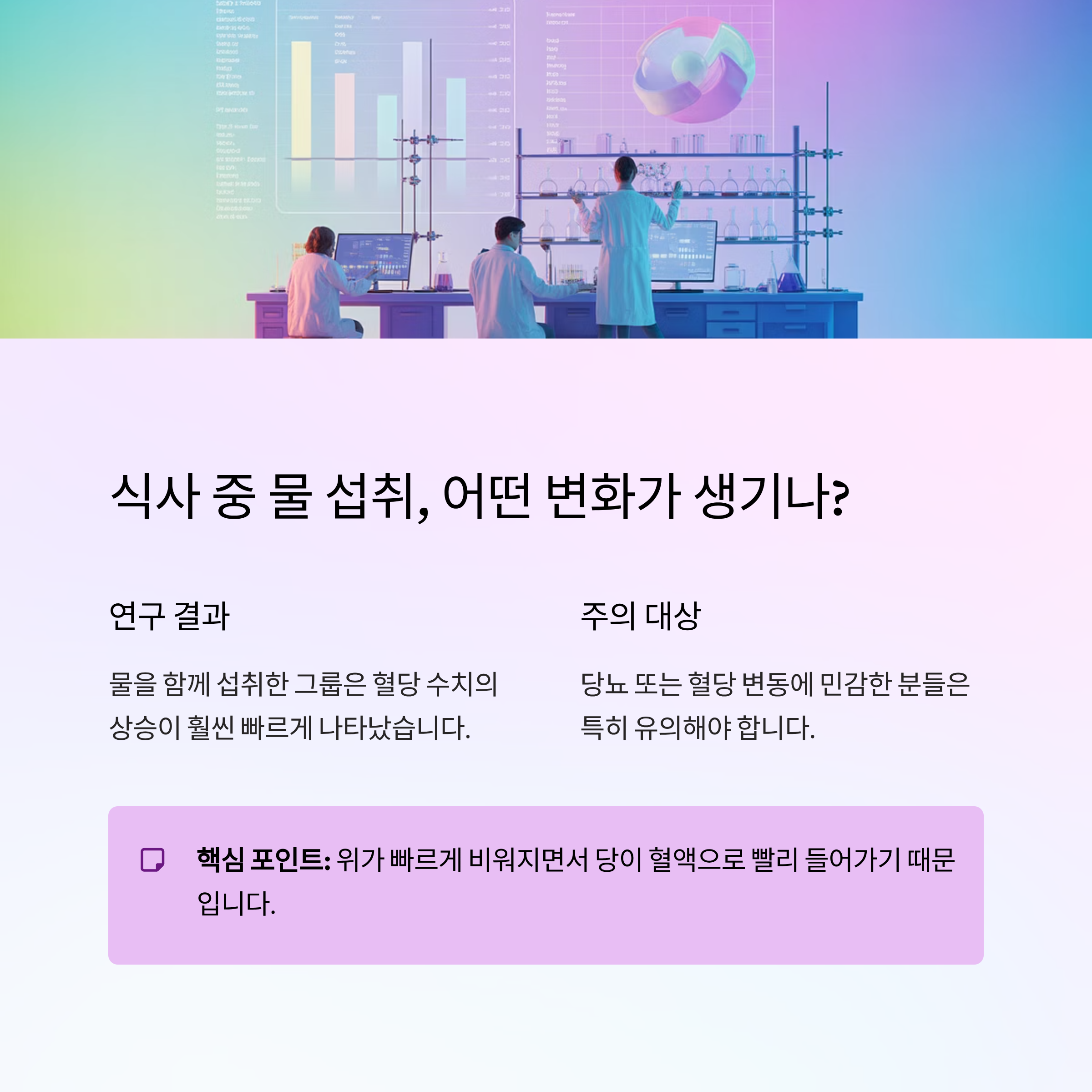 식사 중 물을 마시는 그룹과 그렇지 않은 그룹을 비교한 연구에서, 물을 함께 섭취한 그룹은 혈당 수치의 상승이 훨씬 빠르게 나타났다고 해요.