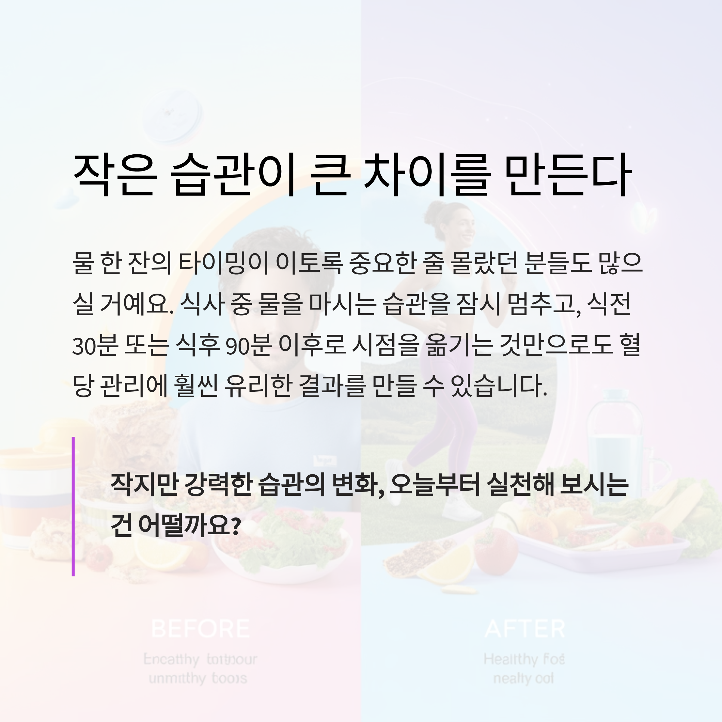 식사 중 물을 마시는 습관을 잠시 멈추고, 식전 30분 또는 식후 90분 이후로 시점을 옮기는 것만으로도 혈당 관리에 훨씬 유리한 결과를 만들 수 있습니다.