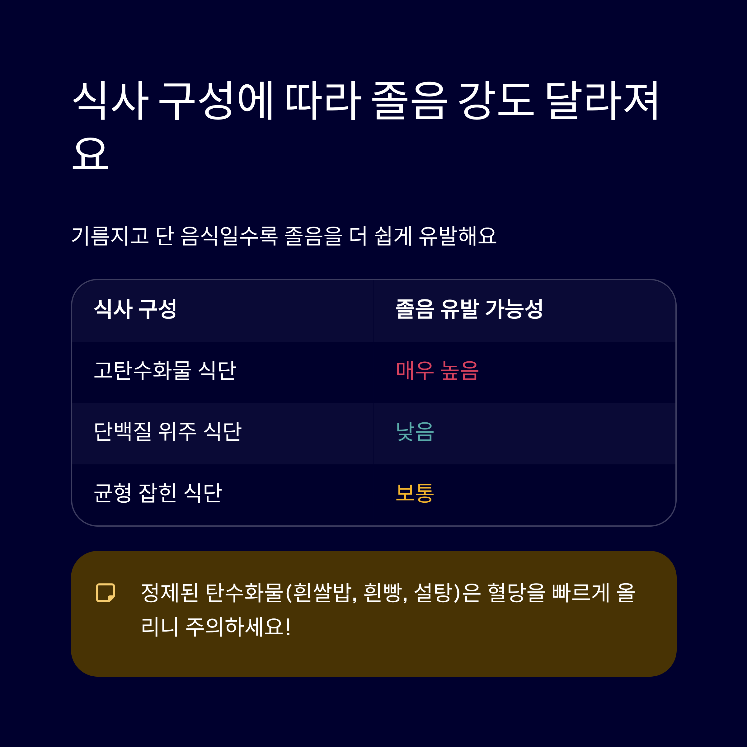 다음 표를 통해 어떤 식단이 졸음을 유발하는지 간단히 정리해볼게요.