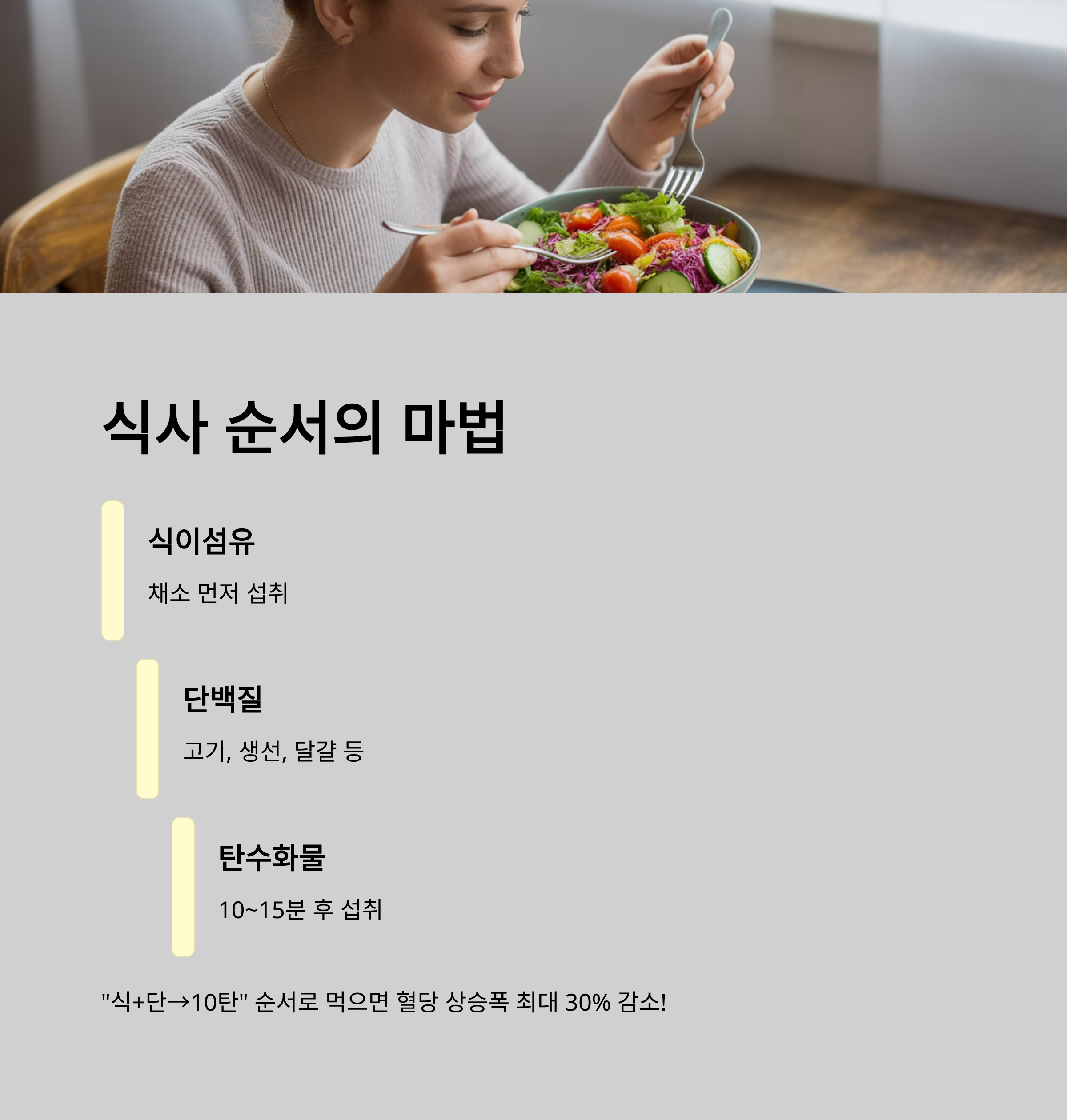 같은 양을 먹더라도 이 순서를 지키면 혈당 상승폭이 최대 30%까지 줄어듭니다.