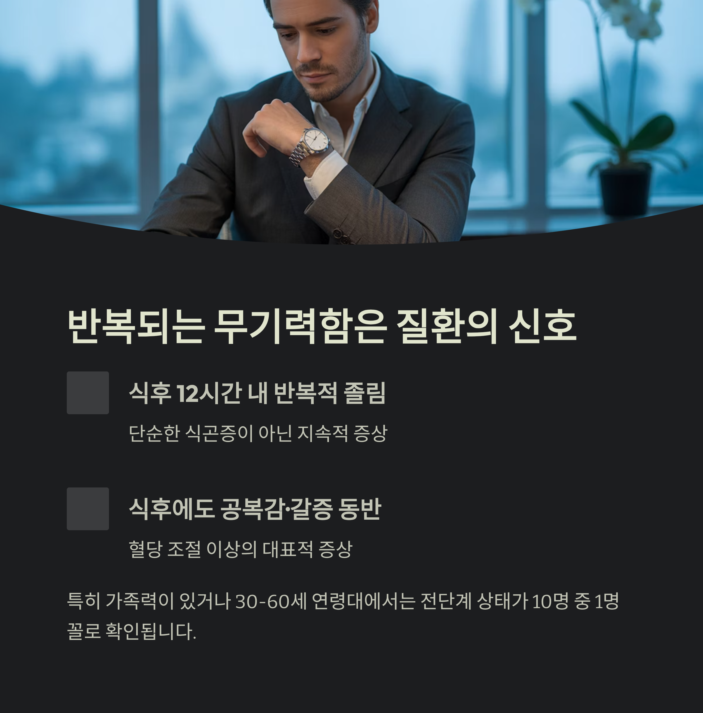 단순한 식곤증이 아닌 "식후 1시간~2시간 사이 반복적인 졸림"이나 식후에도