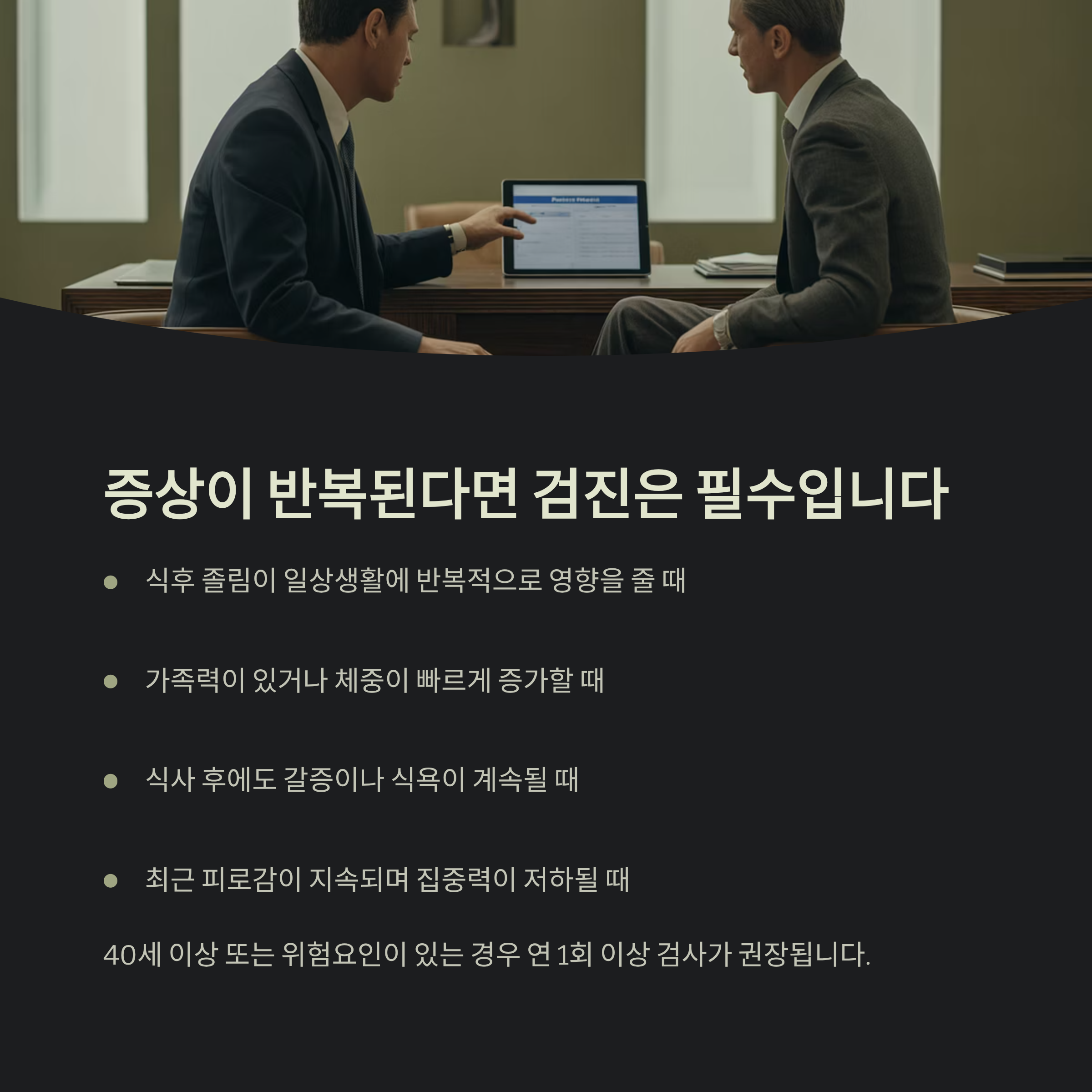 단순한 식곤증이 아닌 "식후 1시간~2시간 사이 반복적인 졸림"이나 식후에도