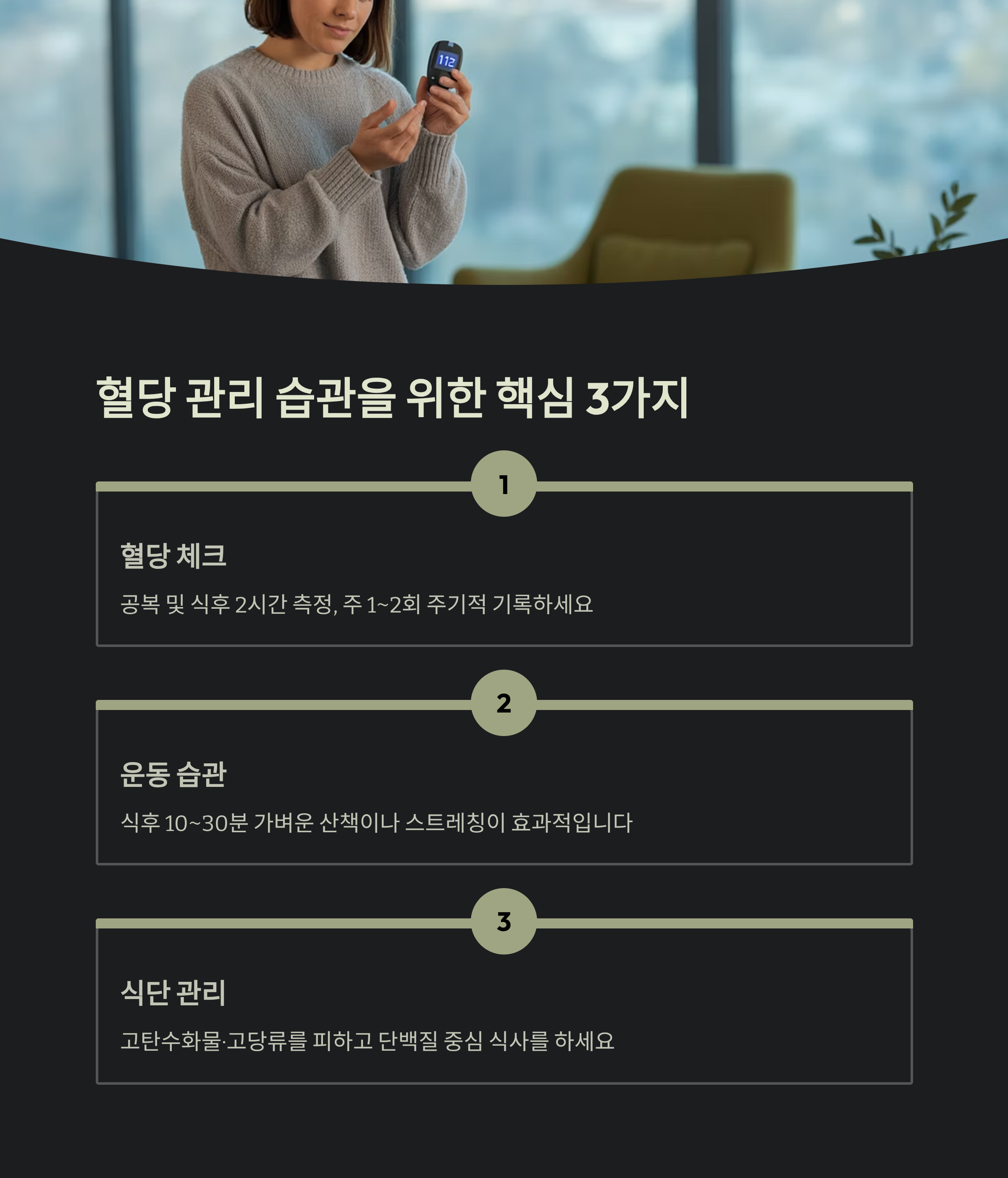 | 식단 관리 | 고탄수화물·고당류 피하고 단백질 중심 식사 |