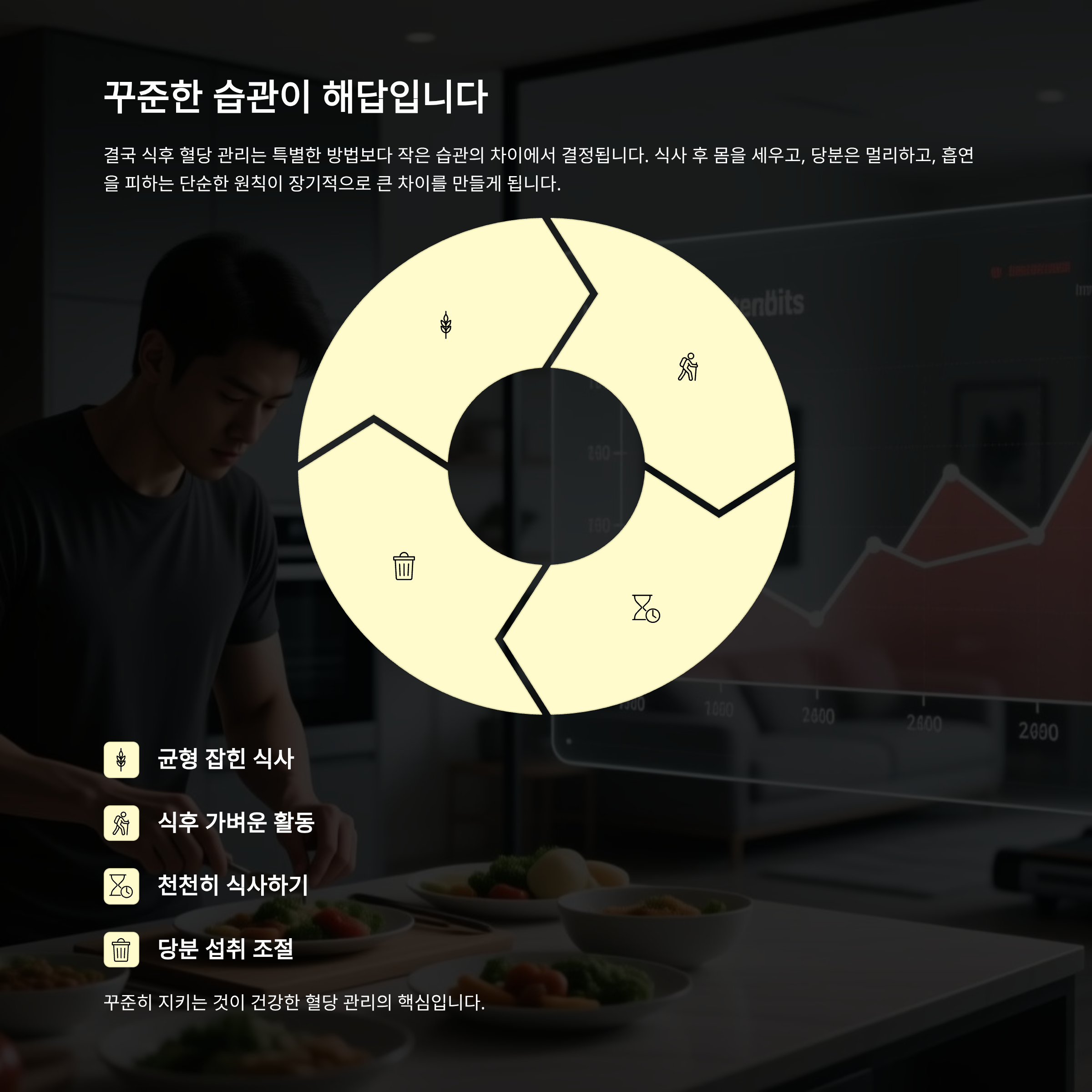 결국 식후 혈당 관리는 특별한 방법보다 작은 습관의 차이에서 결정됩니다. 식사 후 몸을 세우고, 당분은 멀리하고, 흡연을 피하는 단순한 원칙이 장기적으로 큰 차이를 만들게 됩니다. 꾸준히 지키는 것이 건강한 혈당 관리의 핵심입니다.