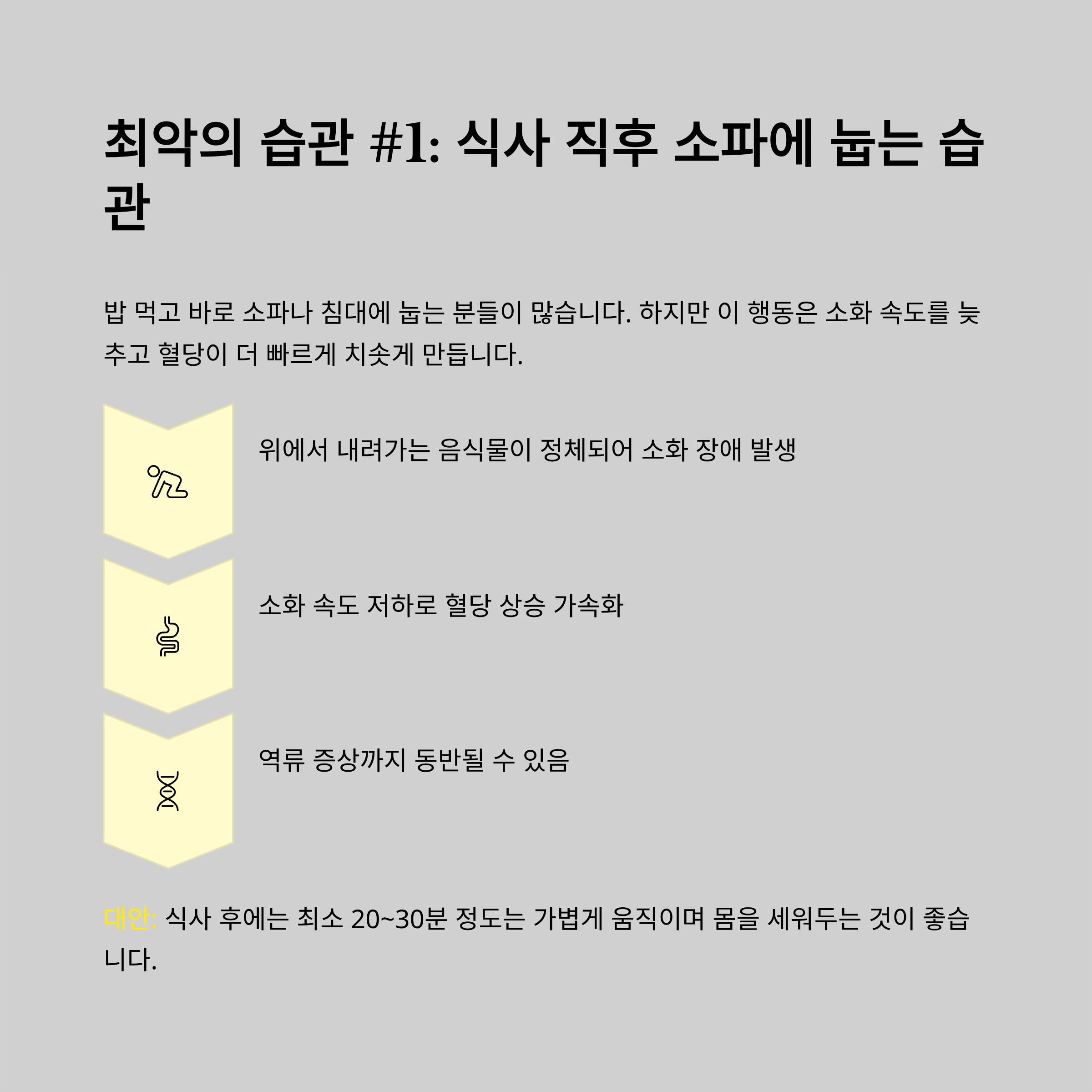 | 식후 바로 눕기 | 소화 지연, 혈당 급상승 | 20분 산책 |