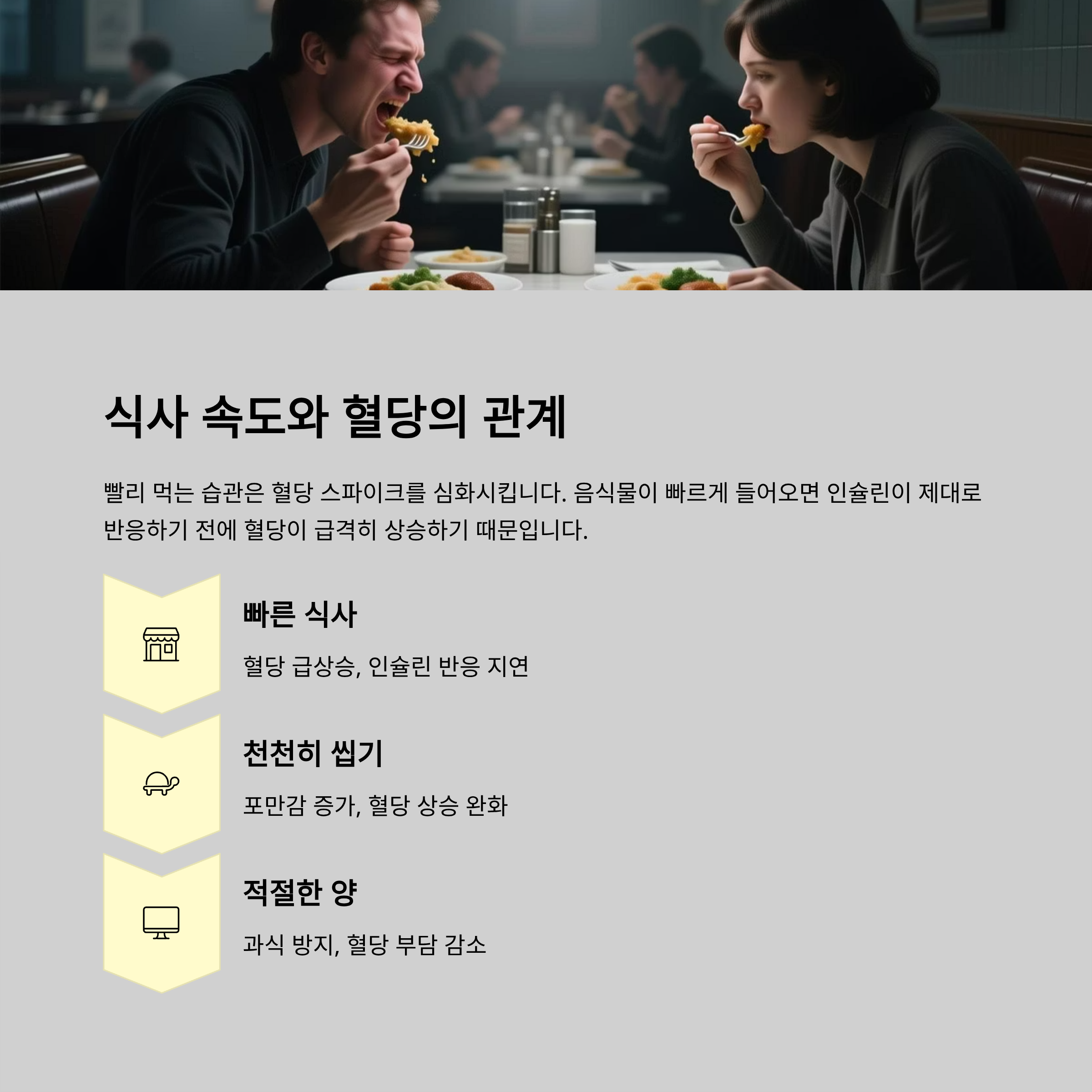 빨리 먹는 습관은 혈당 스파이크를 심화시킵니다. 음식물이 빠르게 들어오면 인슐린이 제대로 반응하기 전에 혈당이 급격히 상승하기 때문이죠. 반대로 천천히 씹으며 먹으면 포만감도 빨리 찾아와 과식을 막고 혈당 상승도 완화됩니다.