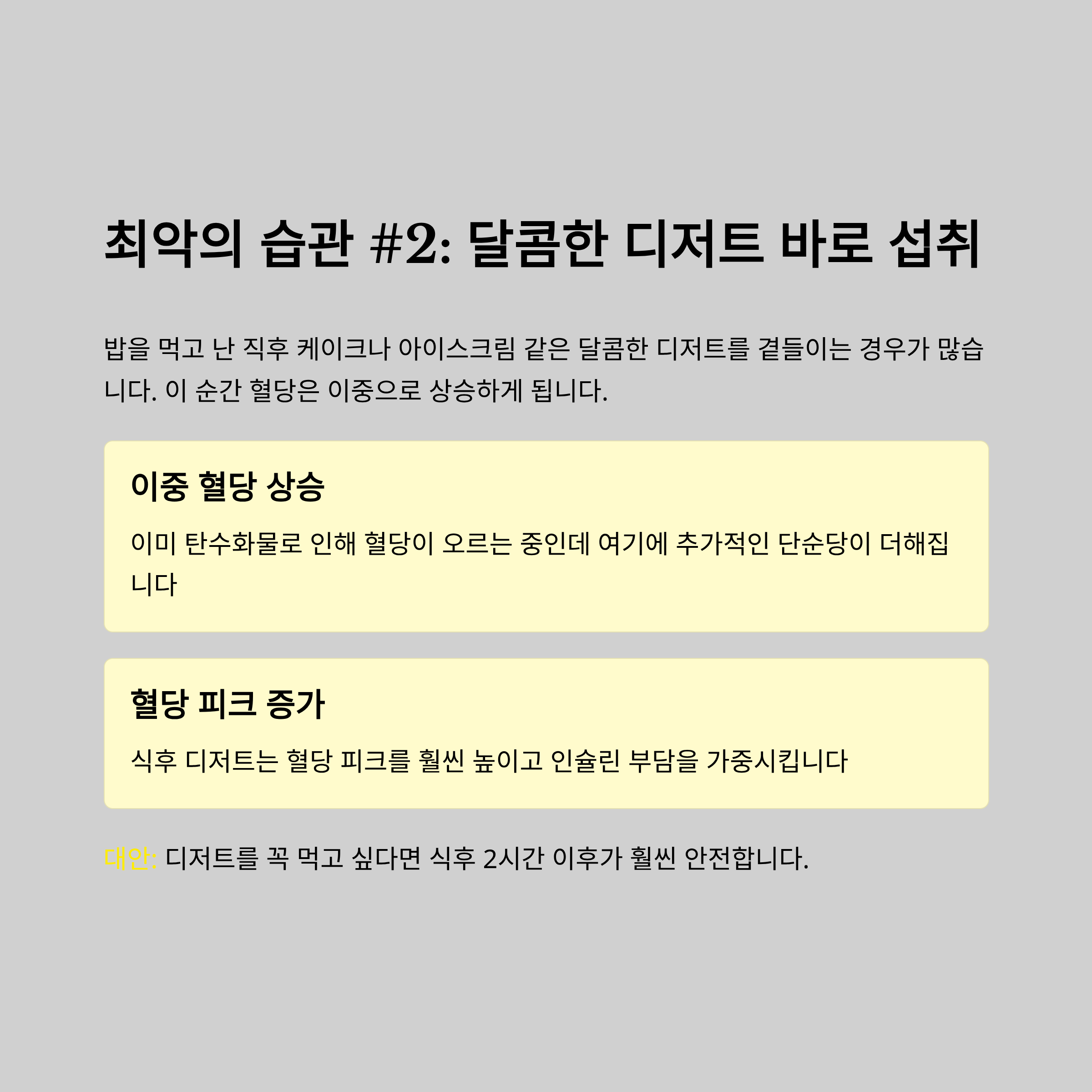 | 달콤한 디저트 섭취 | 혈당 스파이크 심화 | 식후 2시간 뒤 섭취 |