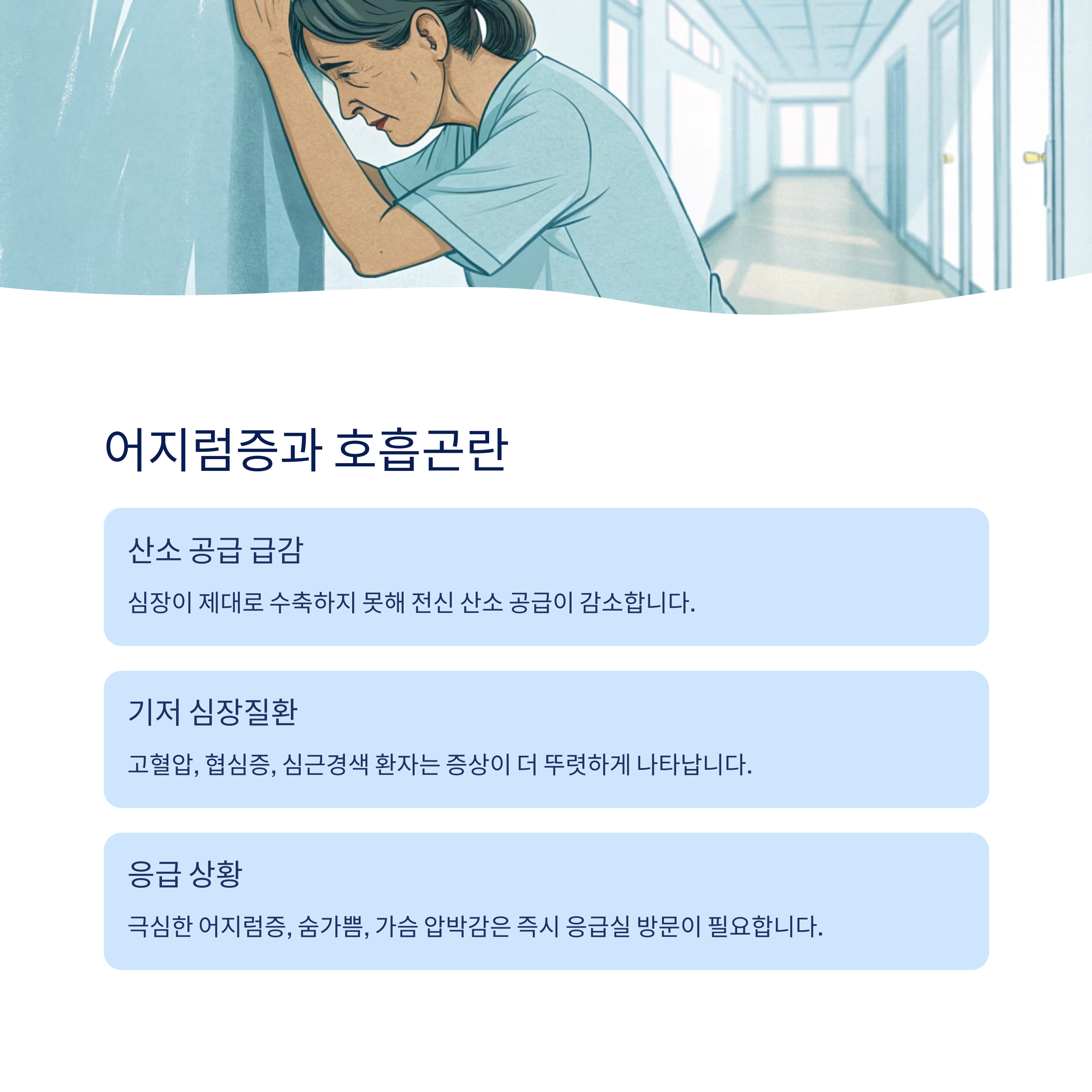 급작스럽고 심한 어지럼증, 숨가쁨은 위험한 징후입니다.