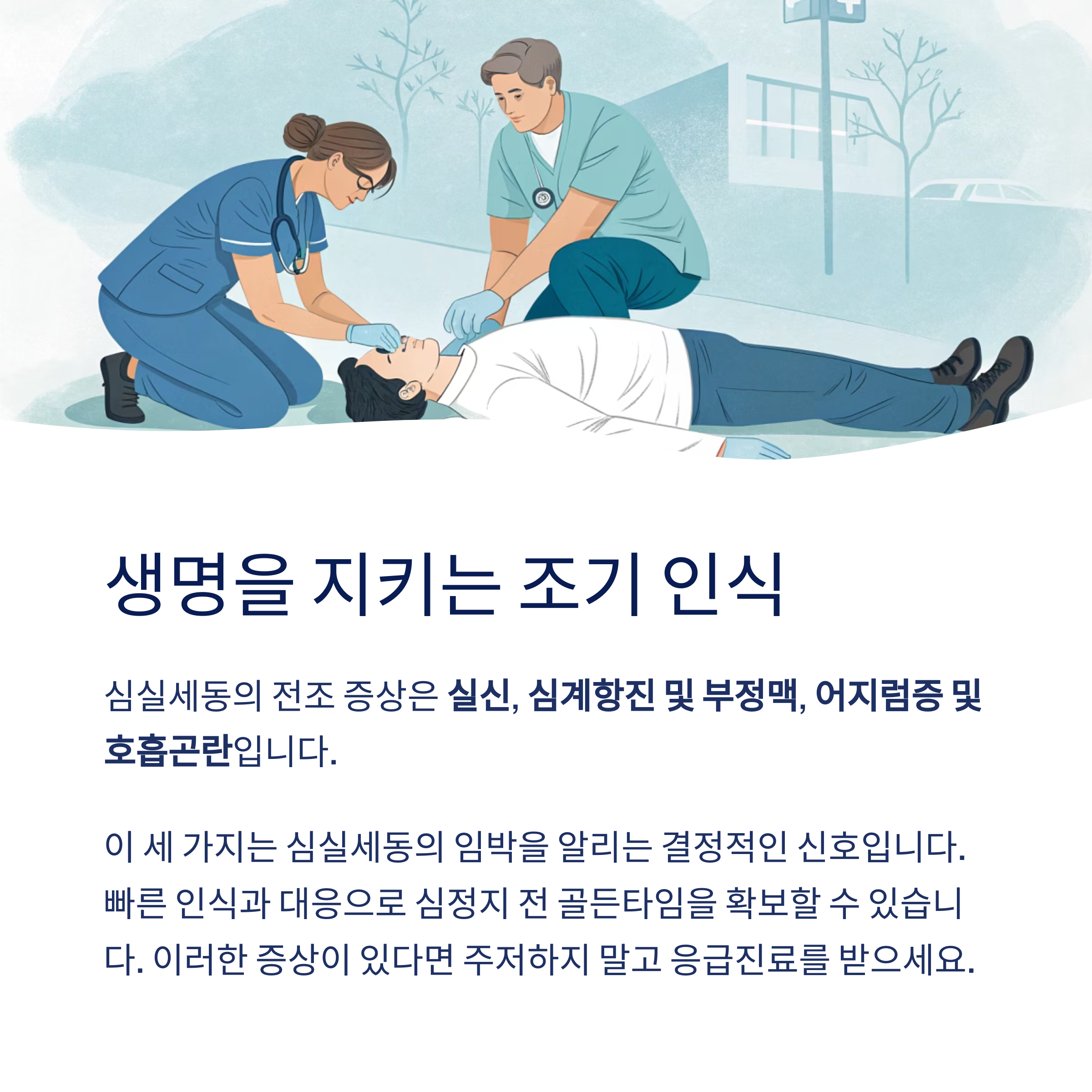 핵심: 심실세동은 심장이 제대로 수축하지 못해 산소 공급이 급감하며, 이로 인해 어지럼증과 호흡곤란이 나타납니다.