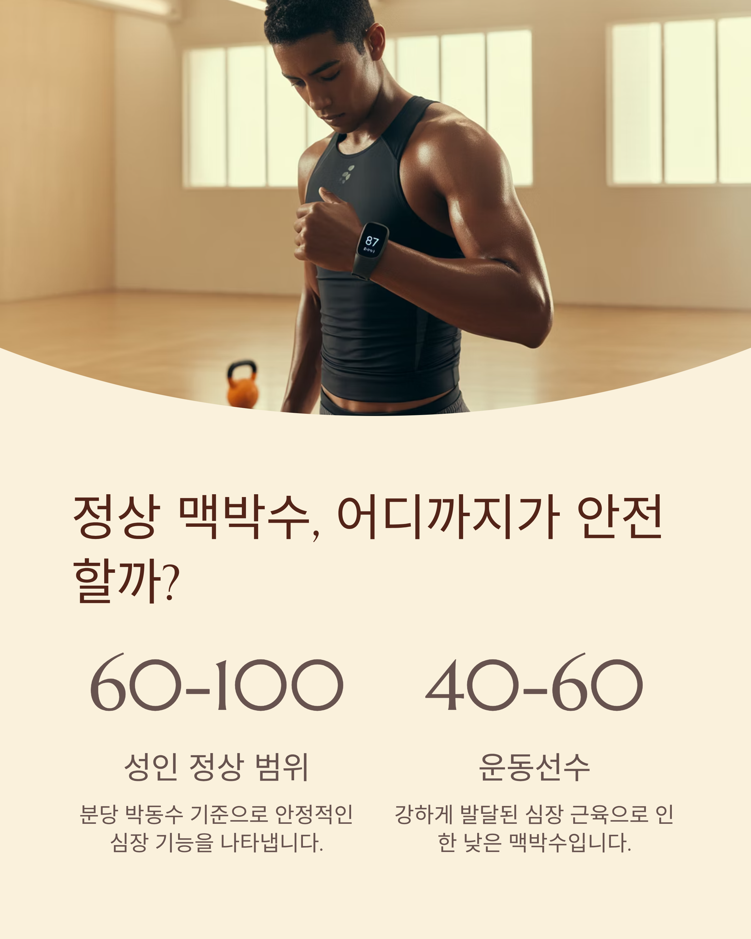 운동선수처럼 심장 근육이 강하게 발달된 사람은 40회~60회 사이로 낮게 나올 수 있습니다. 반면, 아무런 훈련 없이 50회 이하로 떨어진다면 ‘서맥’일 가능성도 있습니다.