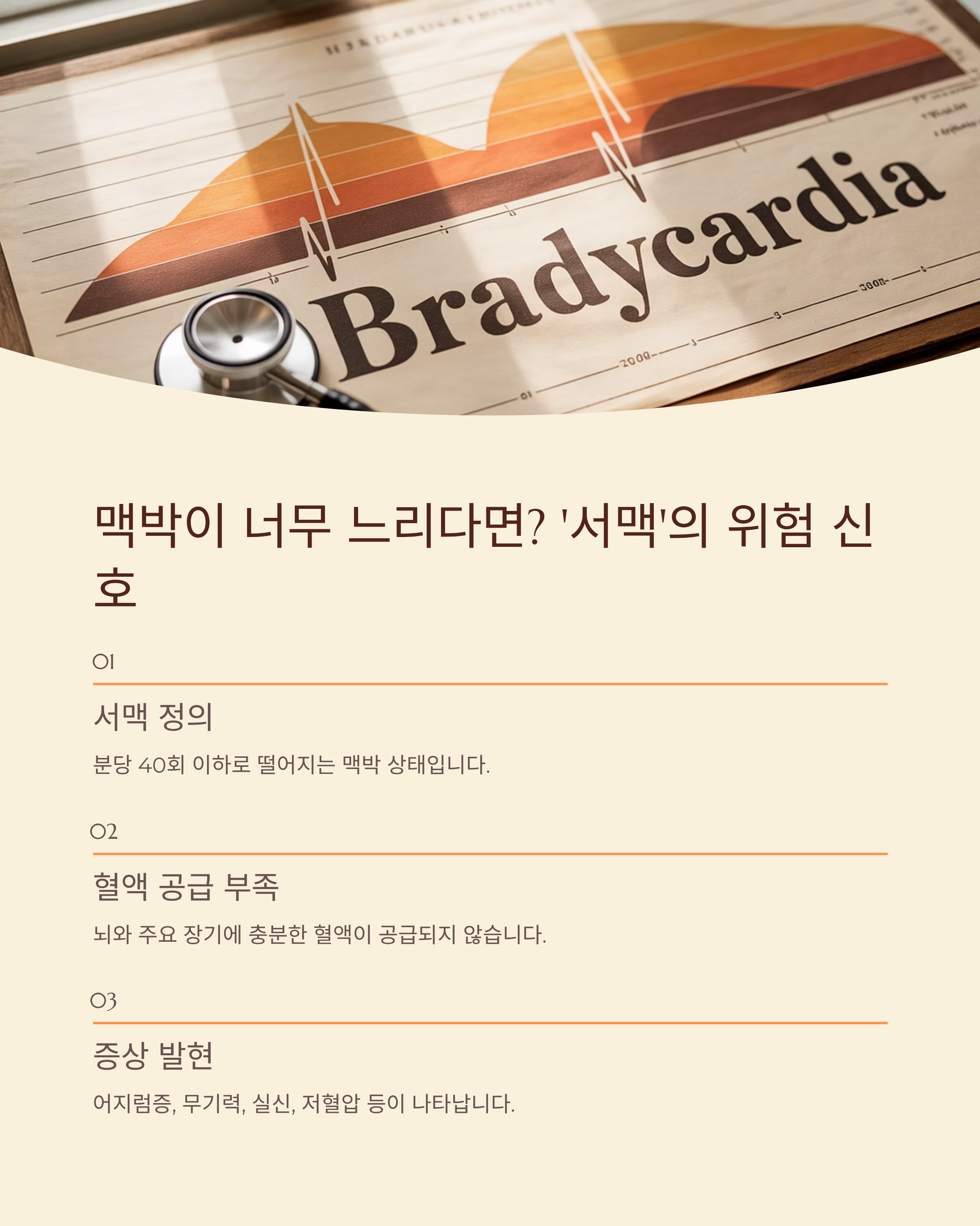맥박이 분당 40회 이하로 떨어질 경우 ‘서맥’으로 분류되며, 뇌와 주요 장기에 혈액이 충분히 공급되지 않을 수 있습니다. 이로 인해 어지럼증, 무기력, 실신, 저혈압 등 일상생활에 큰 영향을 주는 증상이 동반될 수 있습니다.