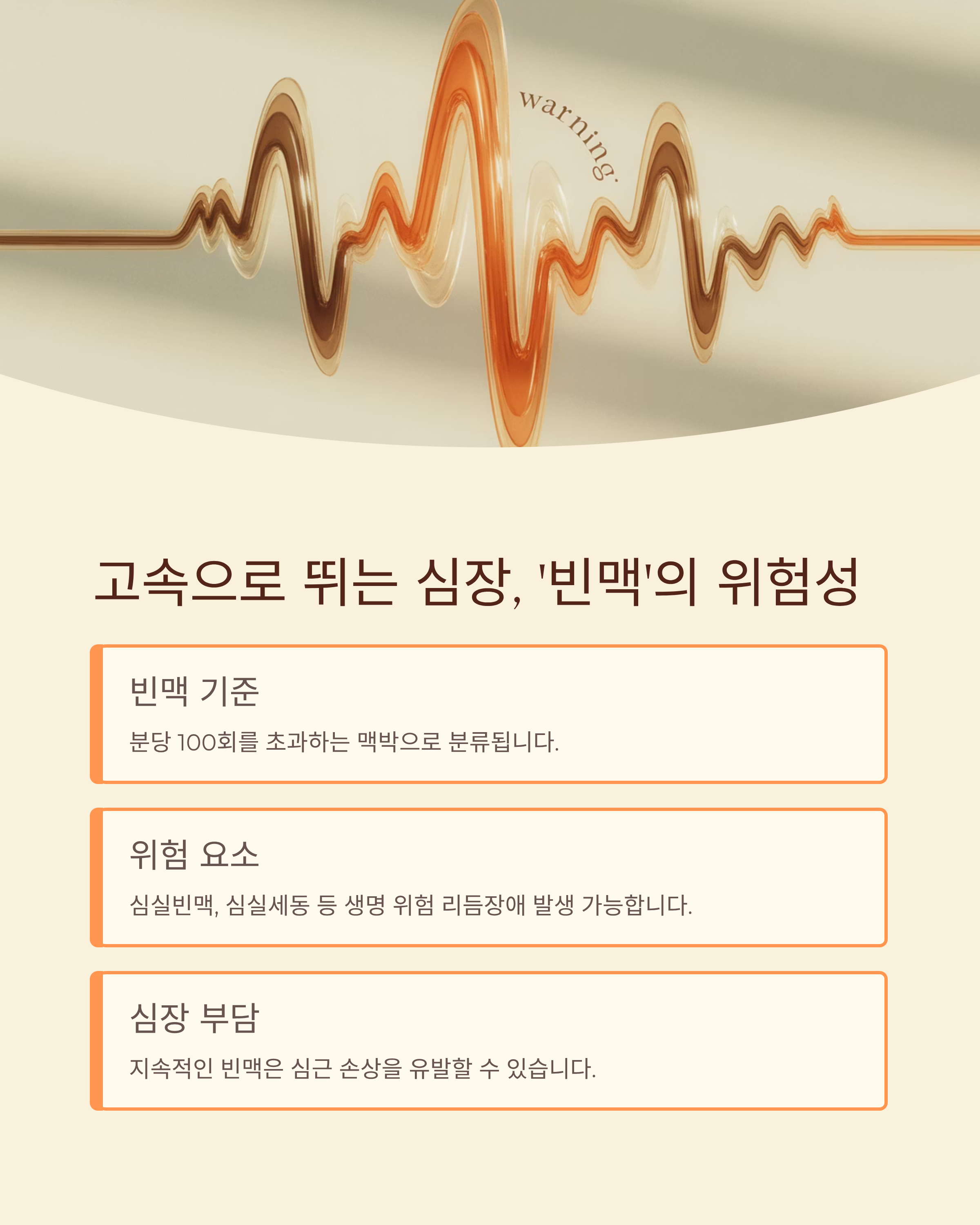 분당 100회를 초과하는 맥박은 ‘빈맥’으로 분류되며, 심실에 과도한 전기신호가 전달될 수 있습니다. 이로 인해 심실빈맥, 심실세동 등 생명을 위협하는 리듬장애가 발생할 수 있으며, 심장 기능 저하로 이어질 수 있습니다.