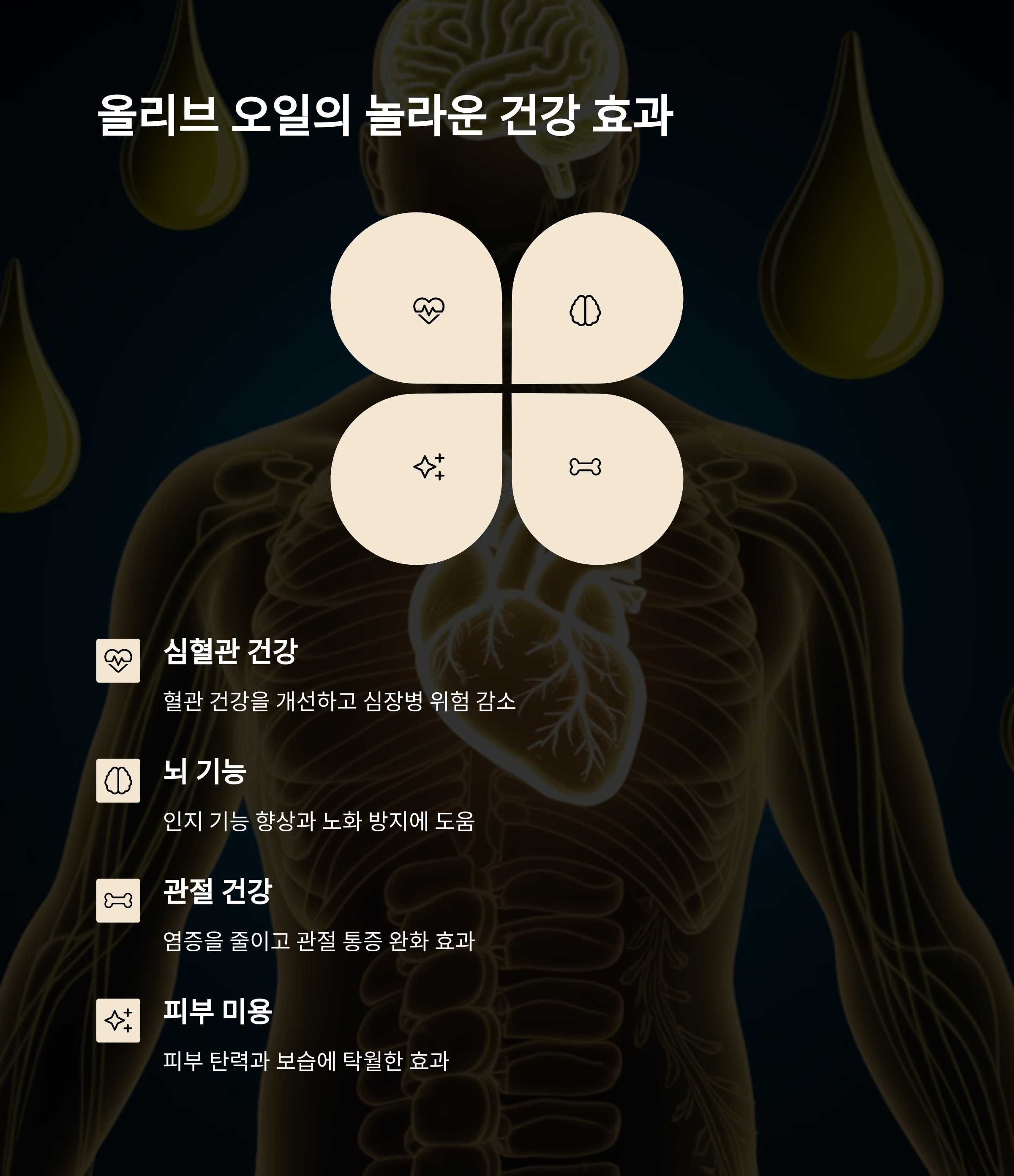 현대 사회에서 건강을 지키는 것은 무엇보다 중요합니다. 특히 심혈관 건강은 우리의 삶의 질을 결정짓는 큰 요소 중 하나입니다. 올리브 오일은 건강을 지키기 위한 선택지 중 하나로 많은 사람들에게 각광받고 있습니다. 미국 FDA에서도 인정할 만큼 그 효능이 입증되었으며, 하루 약 23g 섭취 시 심장 건강에 도움을 줄 수 있다는 연구 결과도 있습니다. 이처럼 올리브 오일은 심혈관 건강을 지키는 데 긍정적인 영향을 줄 수 있습니다. 또한, 올리브 오일에는 올레산이라는 성분이 풍부하게 들어 있어 나쁜 콜레스테롤(LDL)을 줄이고 좋은 콜레스테롤(HDL)을 늘리는 데 도움을 줍니다. 폴리페놀 같은 항산화 물질이 풍부하여 체내 염증을 줄이는 효과도 있으며, 꾸준한 섭취로 심장뿐 아니라 피부, 관절, 뇌 건강에도 긍정적인 영향을 끼칠 수 있습니다. 이러한 이유로 많은 사람들이 일상적인 식습관에 올리브 오일을 적극적으로 활용하고 있으며, 다양한 요리법이나 보관법을 통해 올리브 오일의 효능을 극대화하려는 노력이 이어지고 있습니다. 오늘은 올리브 오일이 가진 놀라운 건강 효과와 함께 올바른 사용 방법 및 주의사항에 대해 자세히 알아보겠습니다.