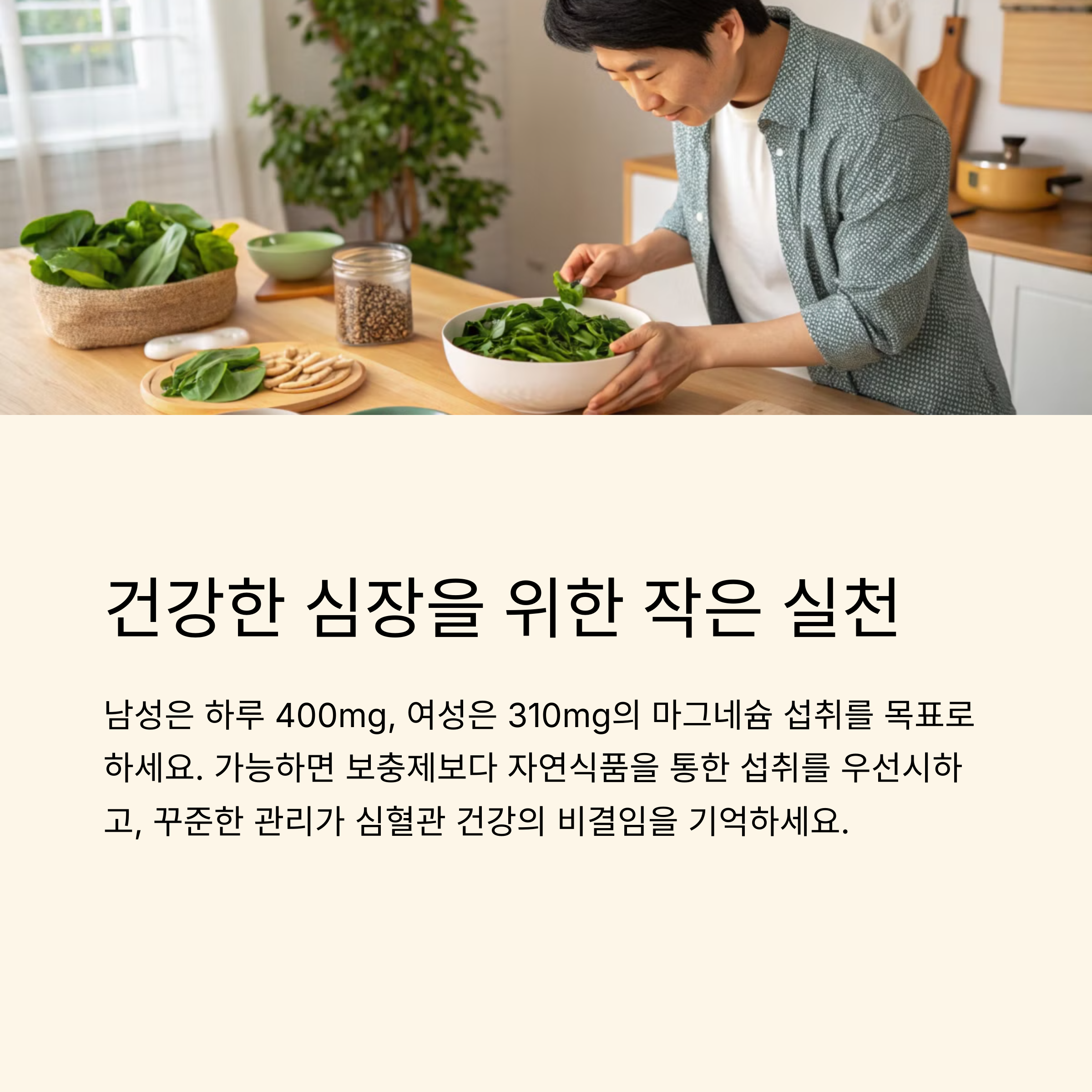 | 심혈관 건강 | 마그네슘은 심장 박동과 혈관 확장에 도움을 줍니다. |