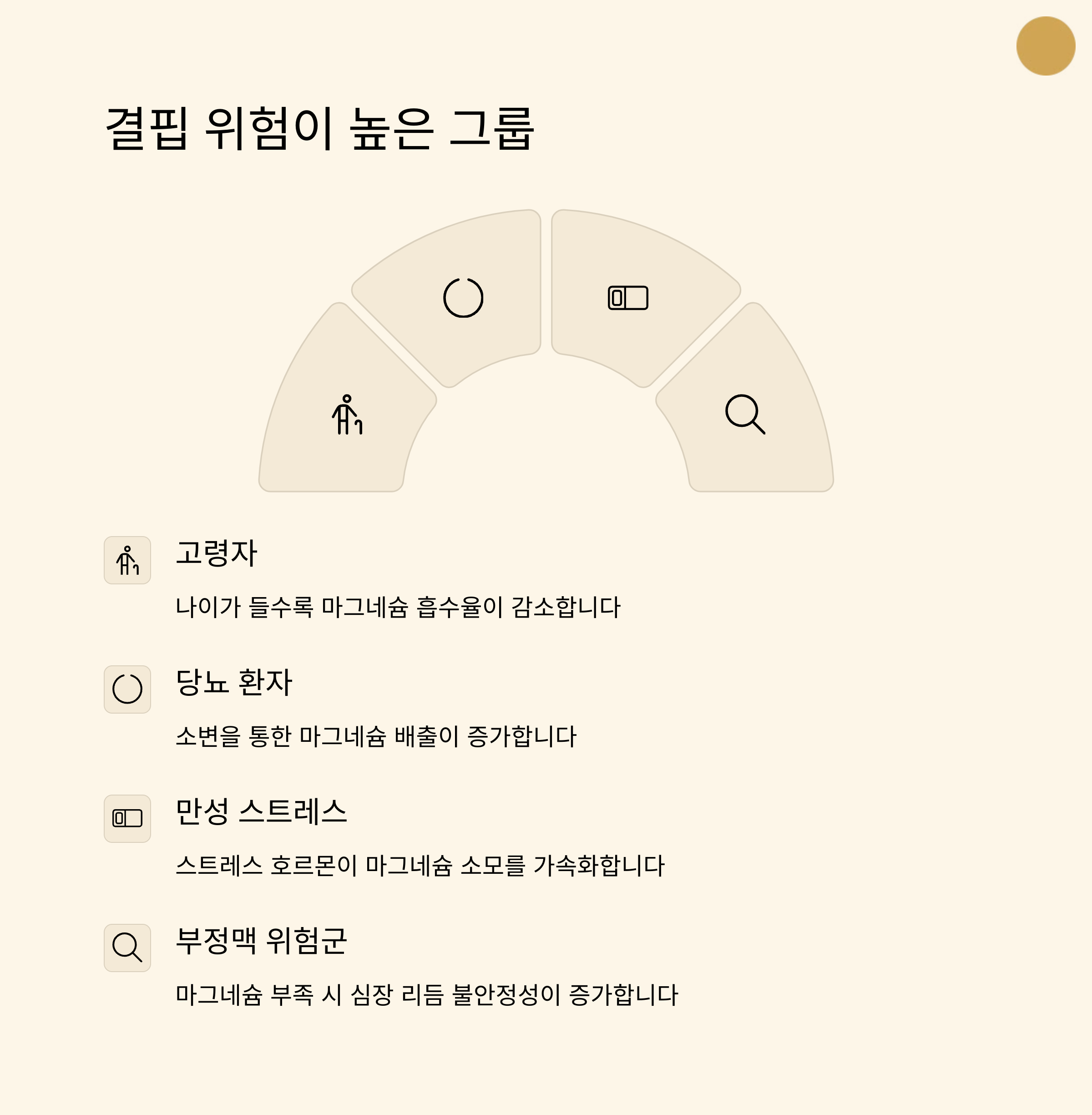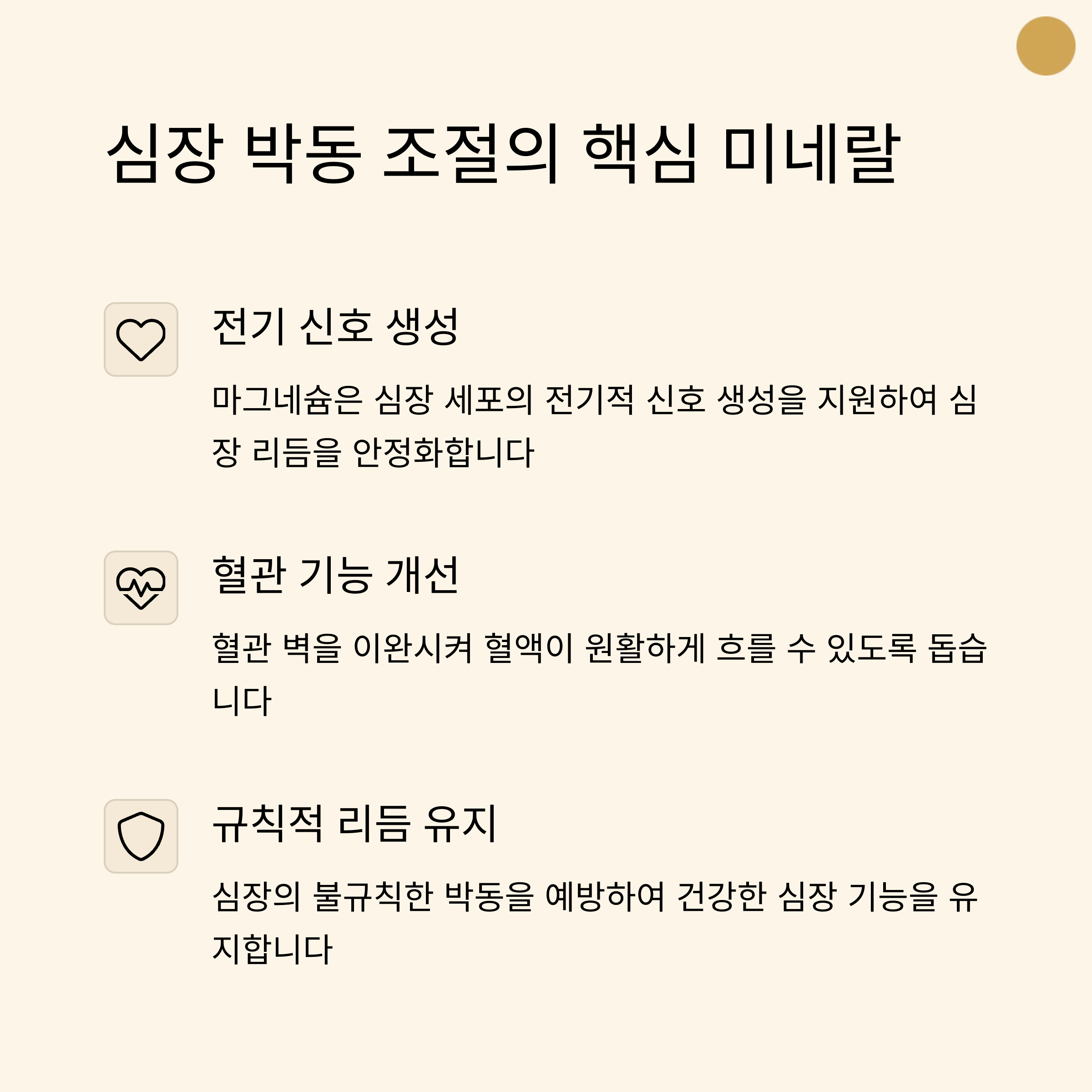 | 심혈관 건강 | 마그네슘은 심장 박동과 혈관 확장에 도움을 줍니다. |