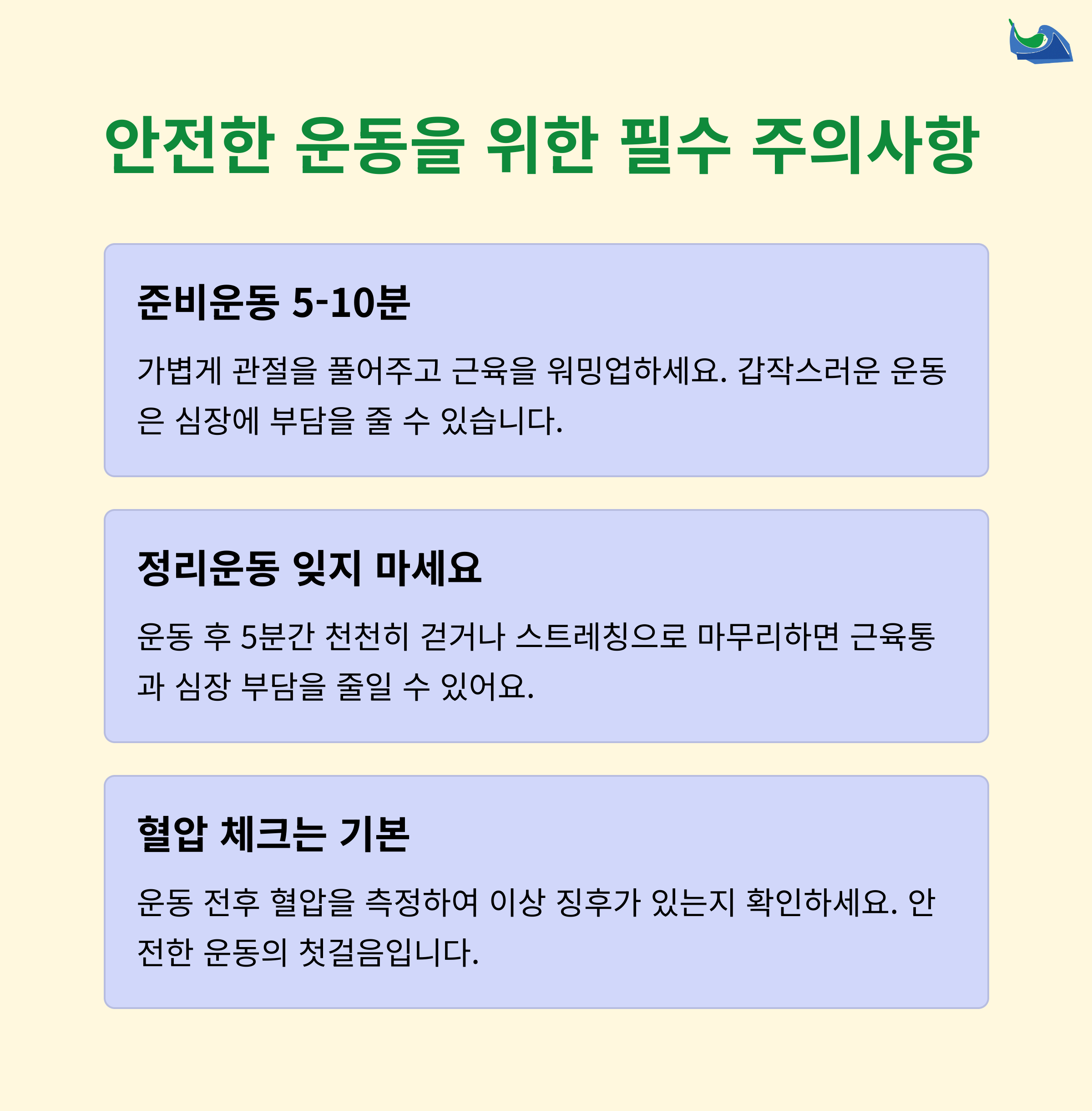 운동이 약이 되려면 '안전'이 최우선이에요. 특히 고혈압이나 심장질환 병력이 있는 분들은 아래 주의사항을 꼭 참고해주세요.
