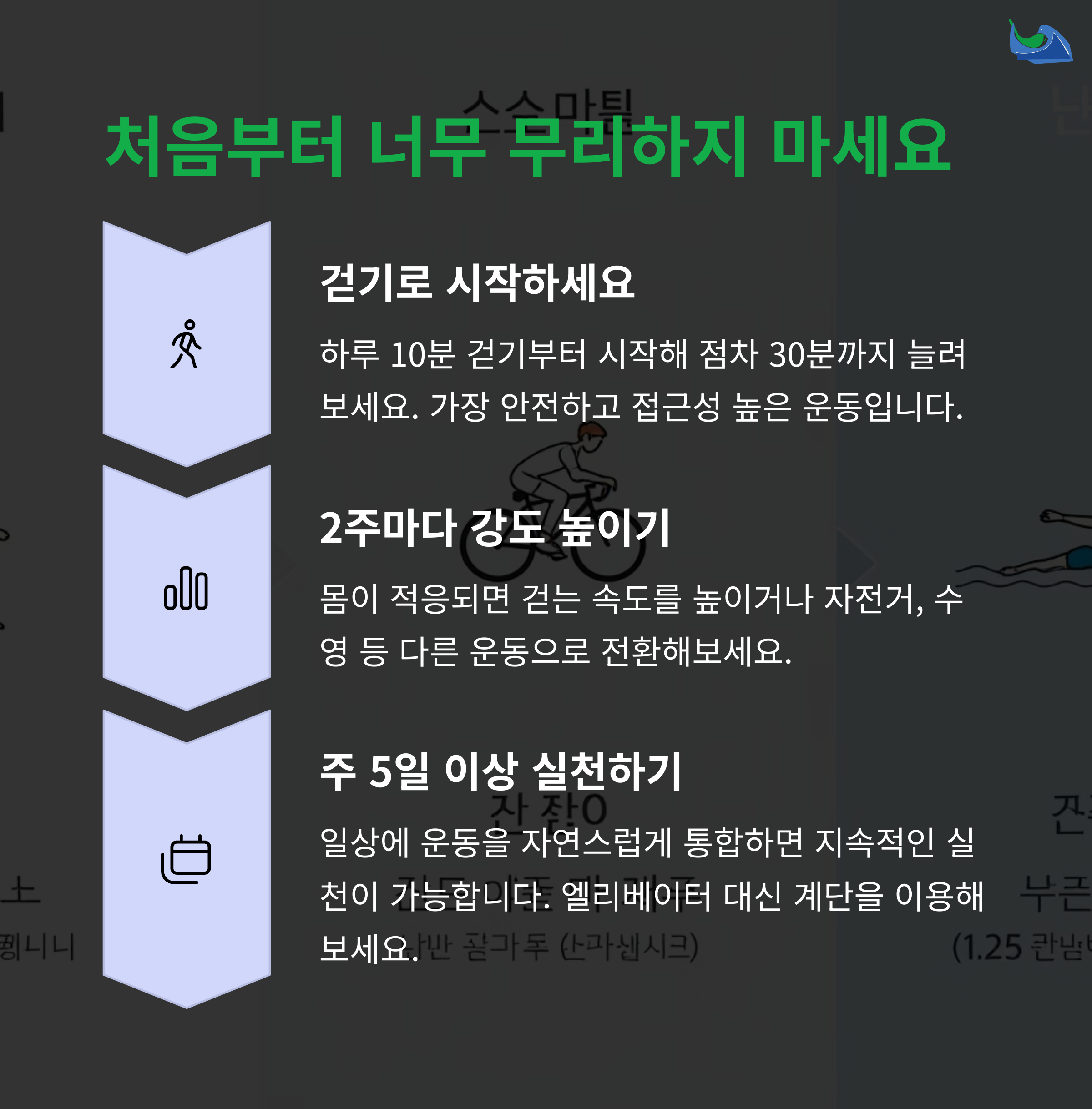 걷기부터 시작하는 것이 좋습니다. 낮은 강도로 시작해 천천히 강도를 높여가는 것이 핵심이에요.