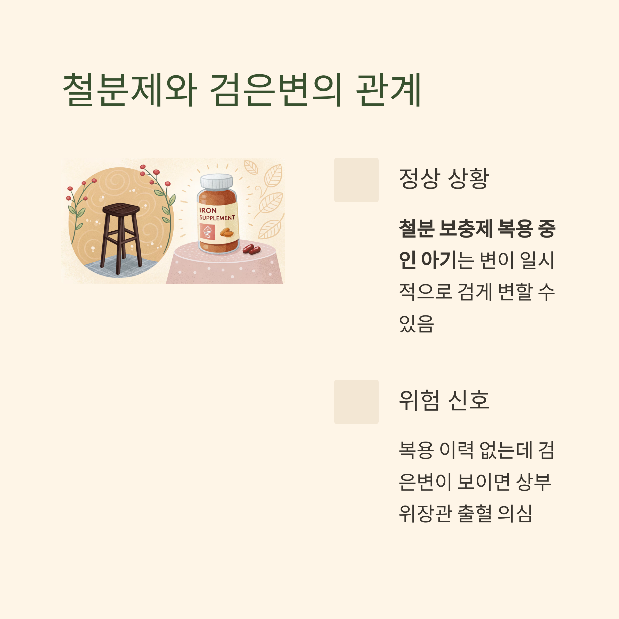 철분 보충제를 복용 중인 아기는 변이 일시적으로 검게 변할 수 있습니다