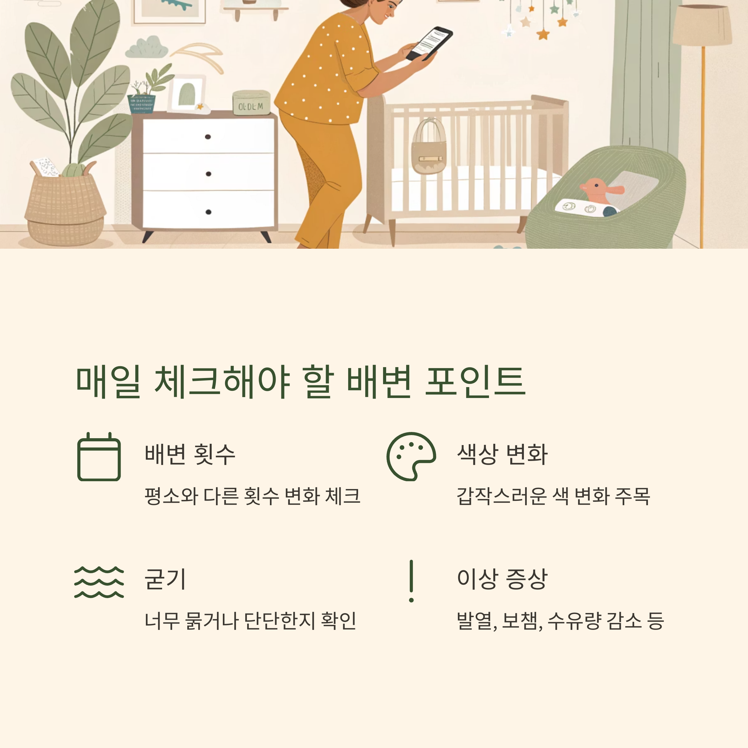 | 이유식 시작 후 | 갈색, 녹색 | 냄새와 굳기 변화 동반 |