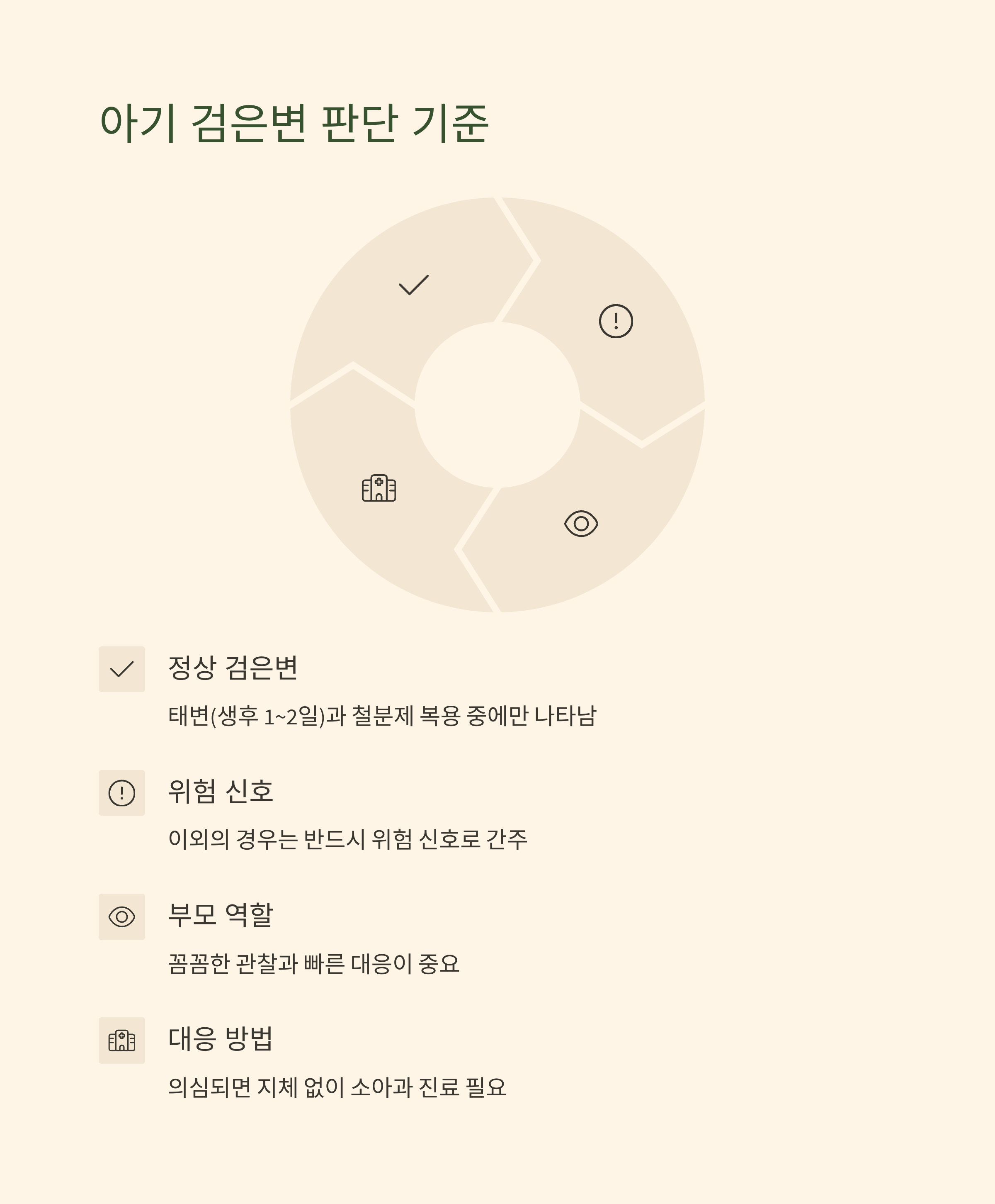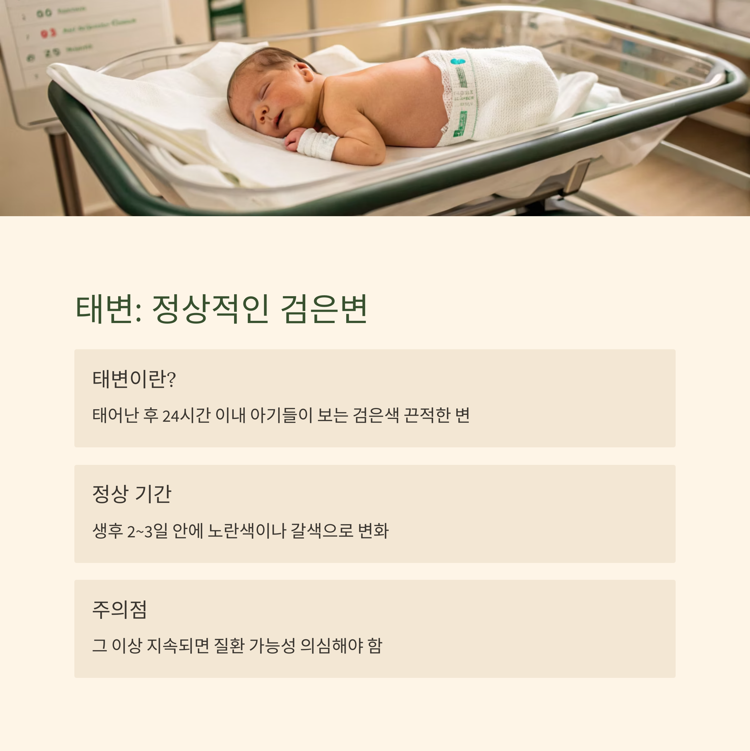 | 태변 | 생후 1일에서 2일 | 3일 이상 지속 |