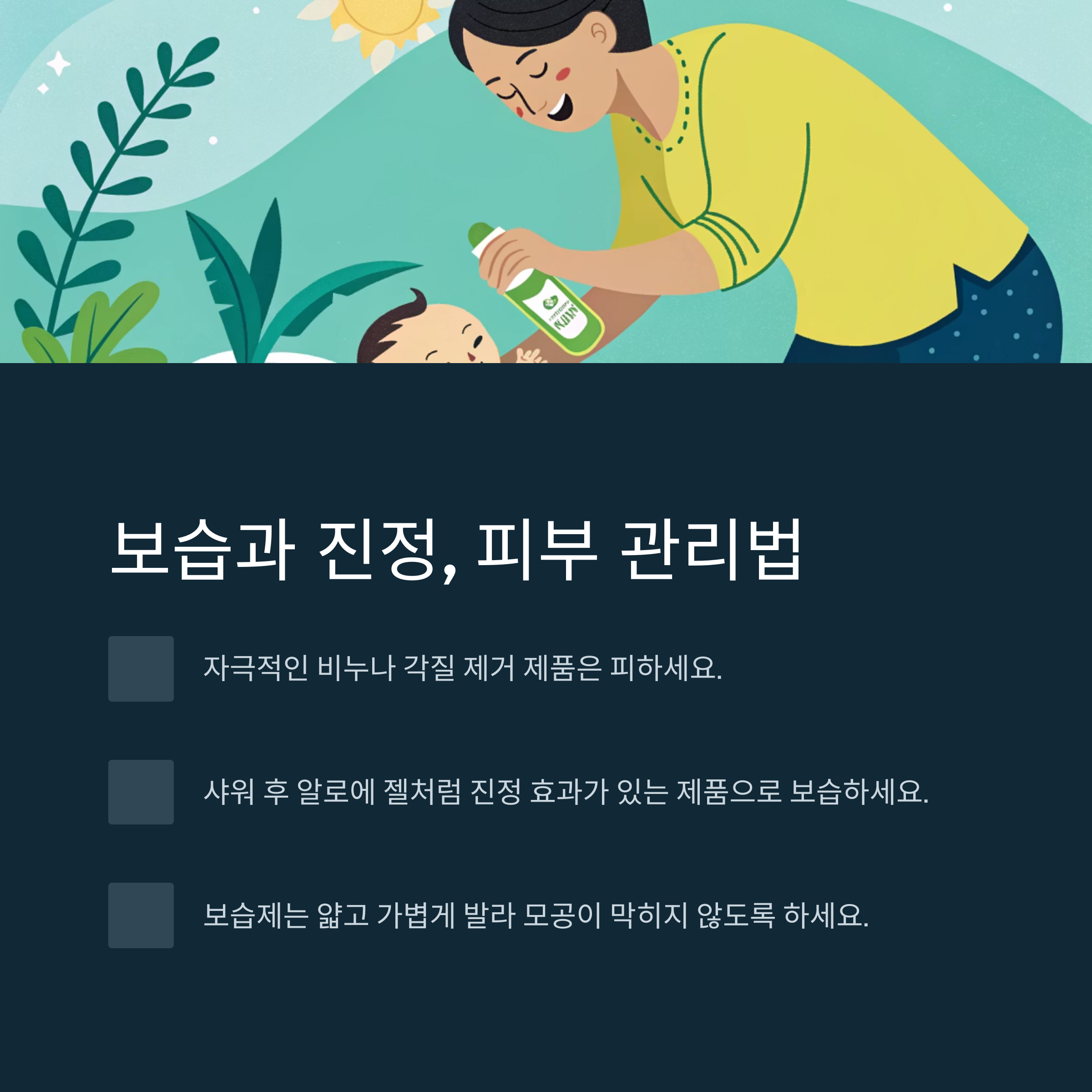 | 보습과 진정 | 얇게 바르는 알로에 젤, 자극 피하기 |