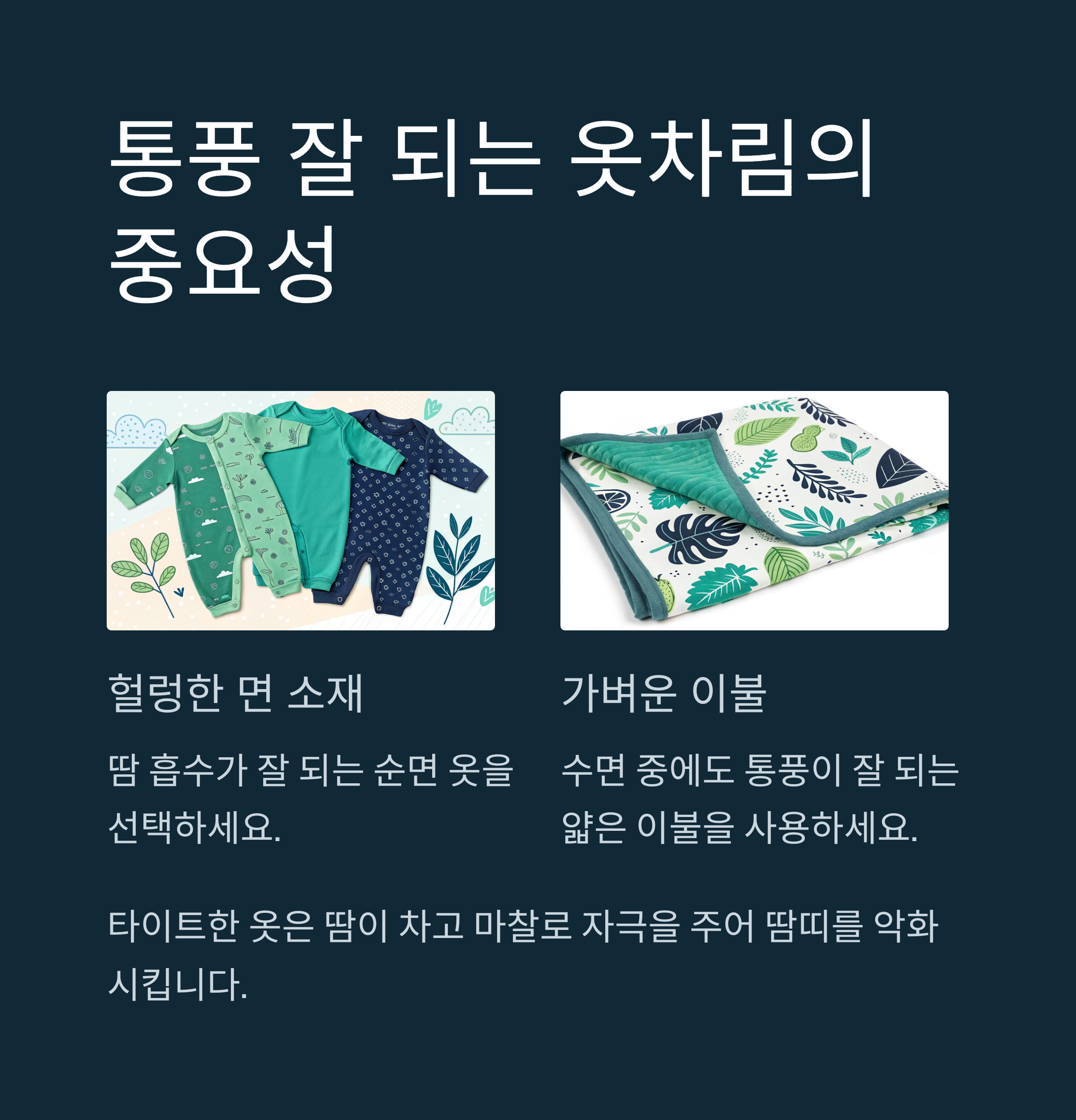소재 선택도 중요하며, 땀 흡수가 잘 되는 순면을 추천합니다.