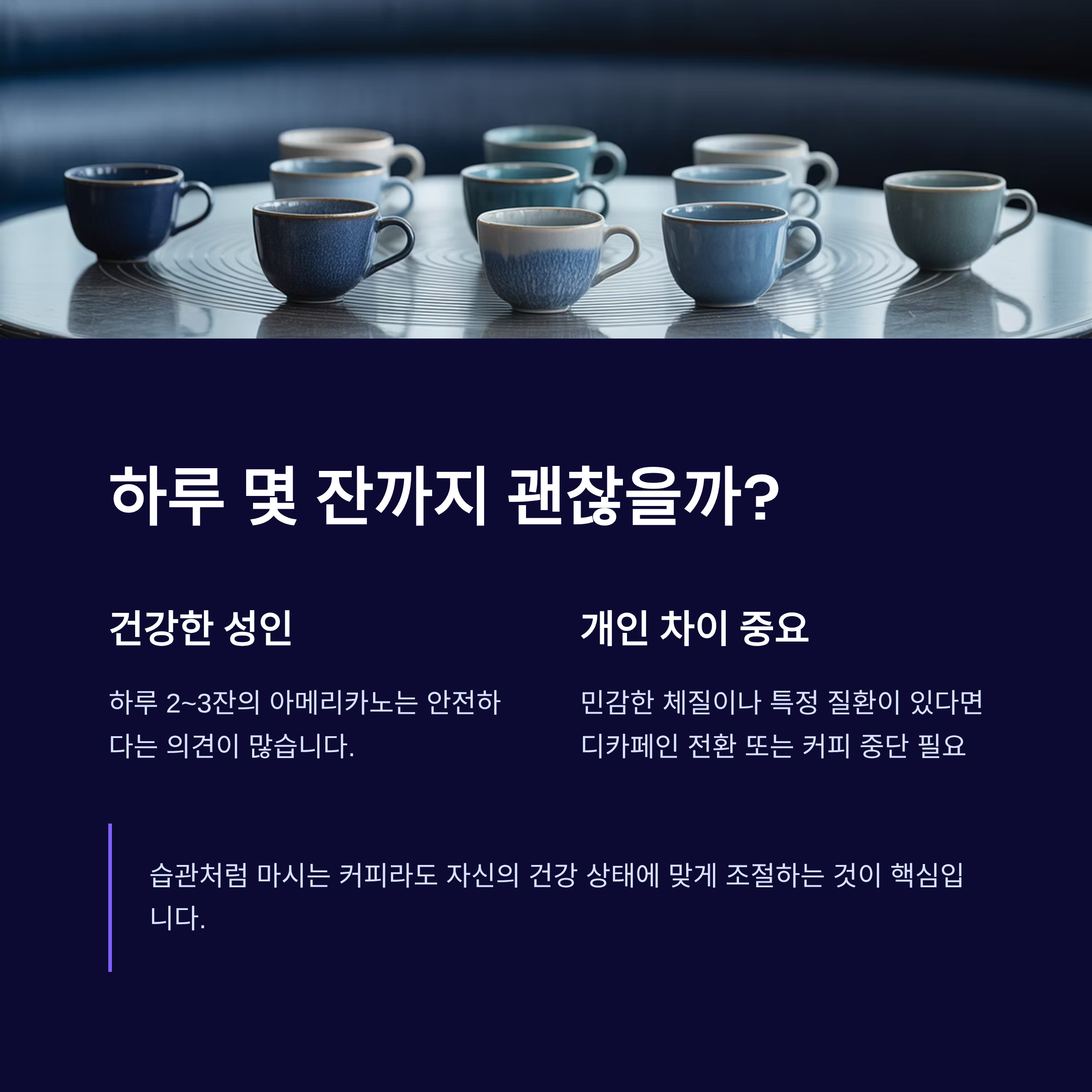 건강한 성인이라면 하루 2~3잔의 아메리카노는 안전하다는 의견이 많습니다. 하지만 모든 건 ‘개인 차이’입니다. 민감한 체질이거나 특정 질환을 갖고 있다면, 디카페인으로 전환하거나 아예 커피를 피하는 것이 필요할 수 있습니다.