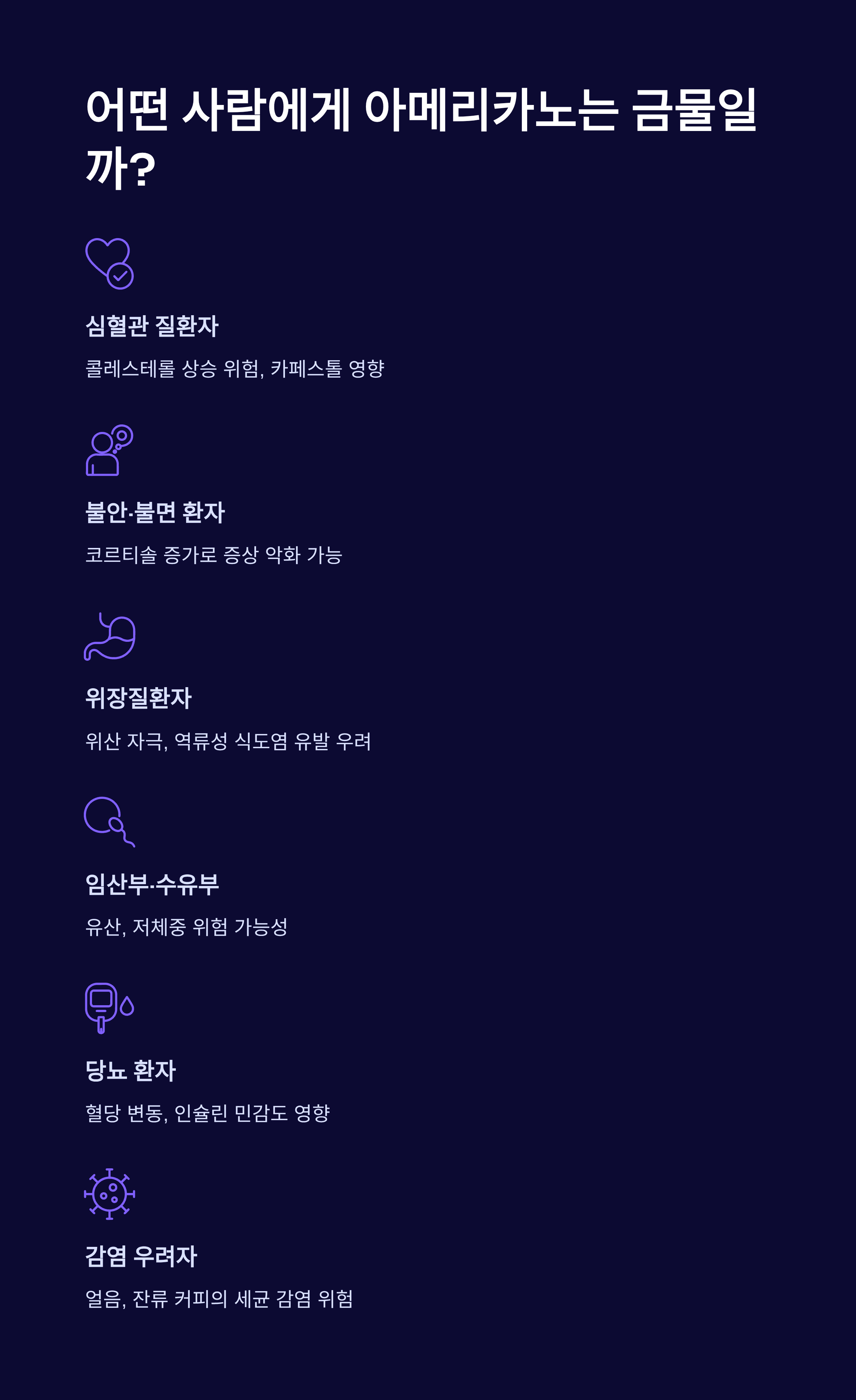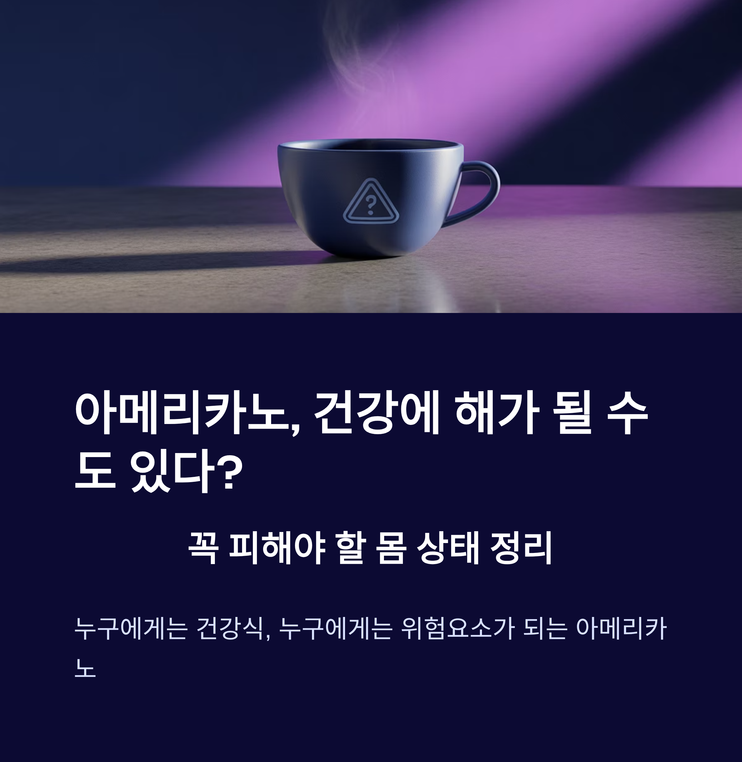 아메리카노는 낮은 칼로리와 간편함으로 많은 사랑을 받고 있지만, 모든 사람에게 적합한 음료는 아닙니다. 특히 특정 질환을 앓고 있거나 민감한 상태의 사람들은 카페인으로 인해 건강에 악영향을 받을 수 있어 주의가 필요합니다. 이 글에서는 아메리카노를 피해야 하는 신체 상태와 그 이유를 과학적 데이터와 함께 정리해 드립니다.