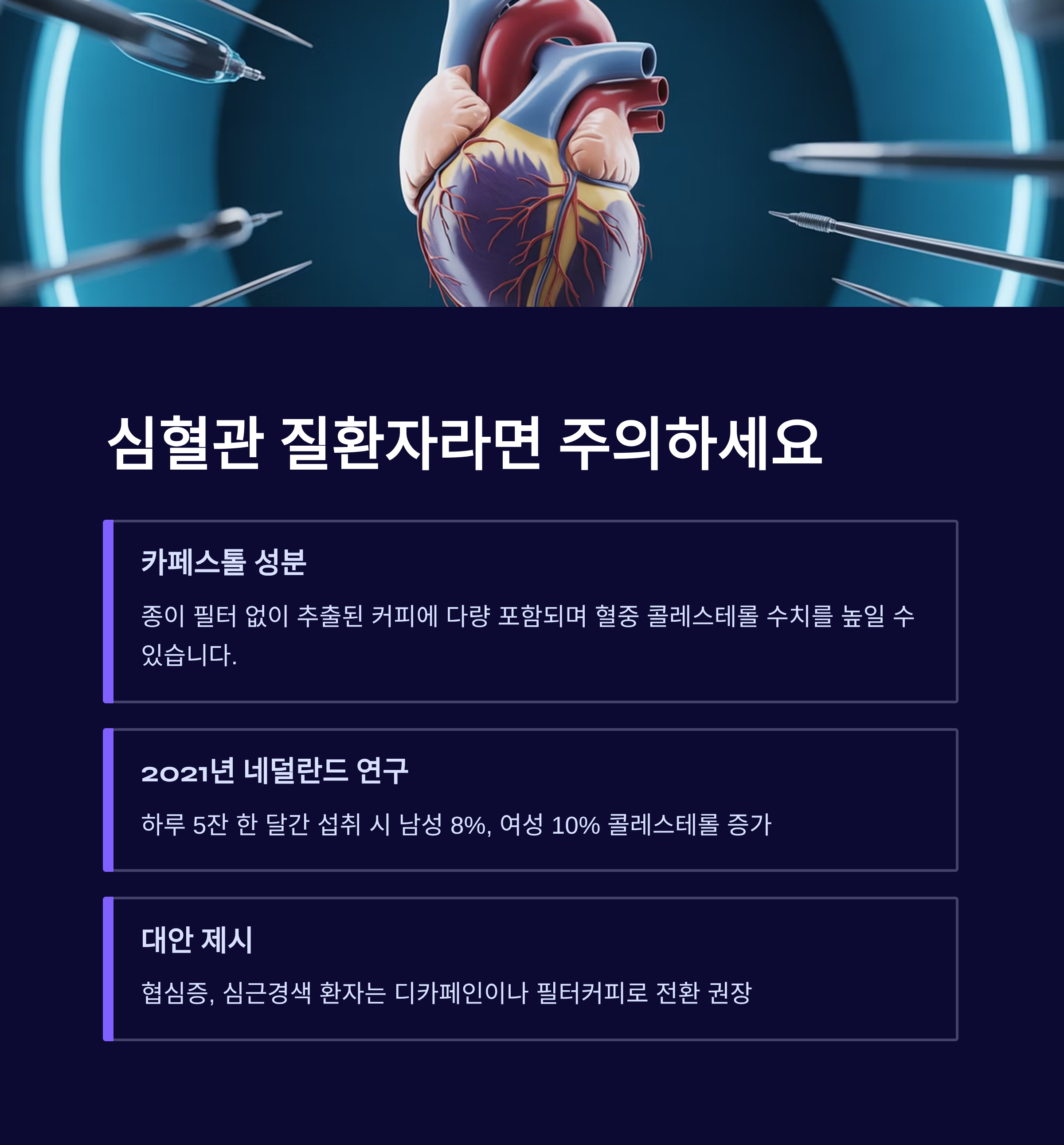 심혈관 질환자에게 가장 문제가 되는 건 ‘카페스톨’이라는 성분입니다. 일반적으로 종이 필터 없이 추출된 커피에는 이 성분이 많이 포함되어 있으며, 혈중 콜레스테롤 수치를 높일 수 있습니다.