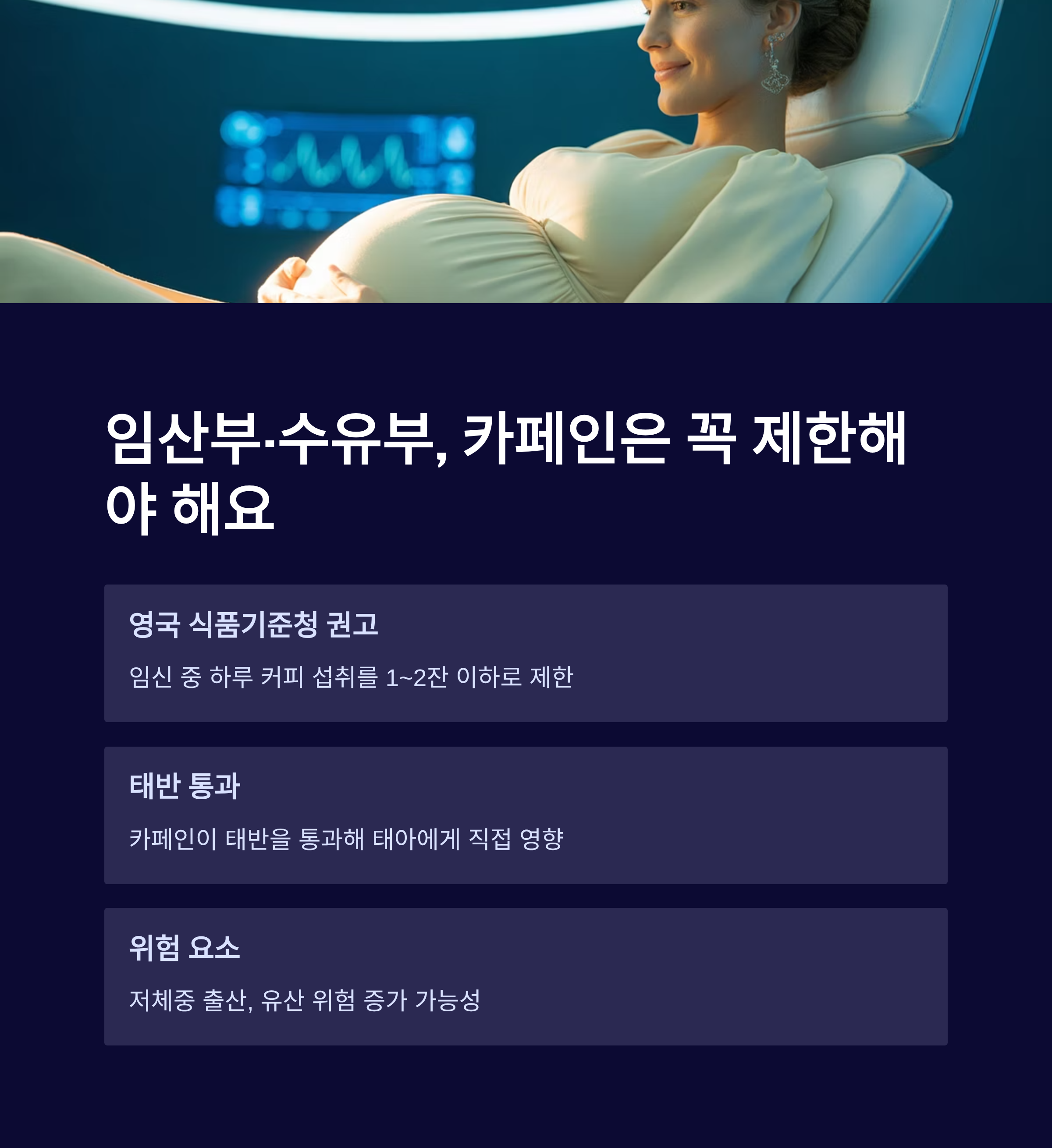 카페인은 태반을 통과해 태아에게 직접 영향을 미칠 수 있으며, 저체중 출산, 유산 위험이 증가할 수 있다는 보고도 있으므로 특히 조심해야 합니다.
