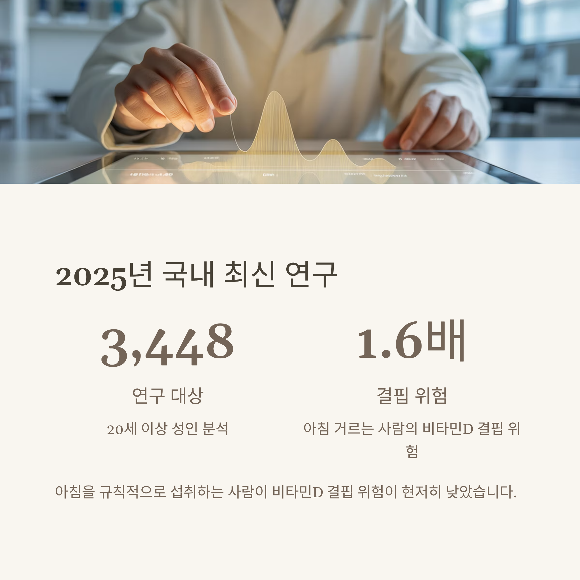 2025년 국내에서 발표된 연구에 따르면, 20세 이상 성인 3448명을 대상으로 아침 식사 습관과 혈중 비타민D 농도를 분석한 결과, 아침을 규칙적으로 섭취하는 사람이 그렇지 않은 사람보다 비타민D 결핍 위험이 낮았습니다. 실제로 아침을 거의 매일 거르는 사람은 아침을 챙기는 사람보다 비타민D 결핍 위험이 약 1.6배 높은 것으로 나타났습니다.