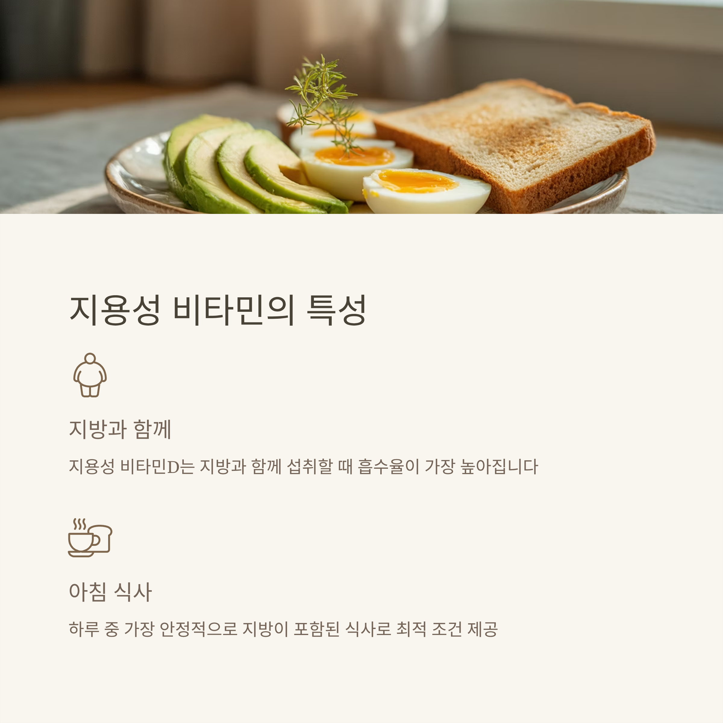 비타민D는 지용성 비타민입니다. 즉, 지방과 함께 섭취했을 때 흡수율이 가장 높아지는 특성이 있는데요. 아침 식사는 대체로 하루 중 가장 안정적으로 지방이 포함된 식사이기 때문에 비타민D 흡수에 최적화된 조건을 제공합니다. 반면 공복이나 간단한 식사 후에 섭취하면 흡수율이 떨어질 수 있습니다.