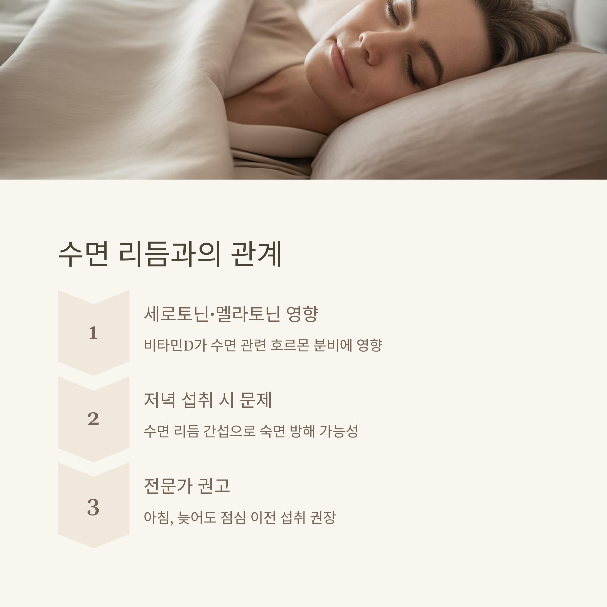 비타민D는 수면과 관련된 세로토닌, 멜라토닌 분비에 영향을 줄 수 있습니다. 일부 사람의 경우 저녁이나 자기 전 비타민D를 섭취할 경우 수면 리듬에 간섭을 받아 숙면에 방해가 되기도 하는데요. 때문에 전문가들은 비타민D는 아침, 늦어도 점심 이전에 섭취하는 것이 바람직하다고 권고하고 있습니다.