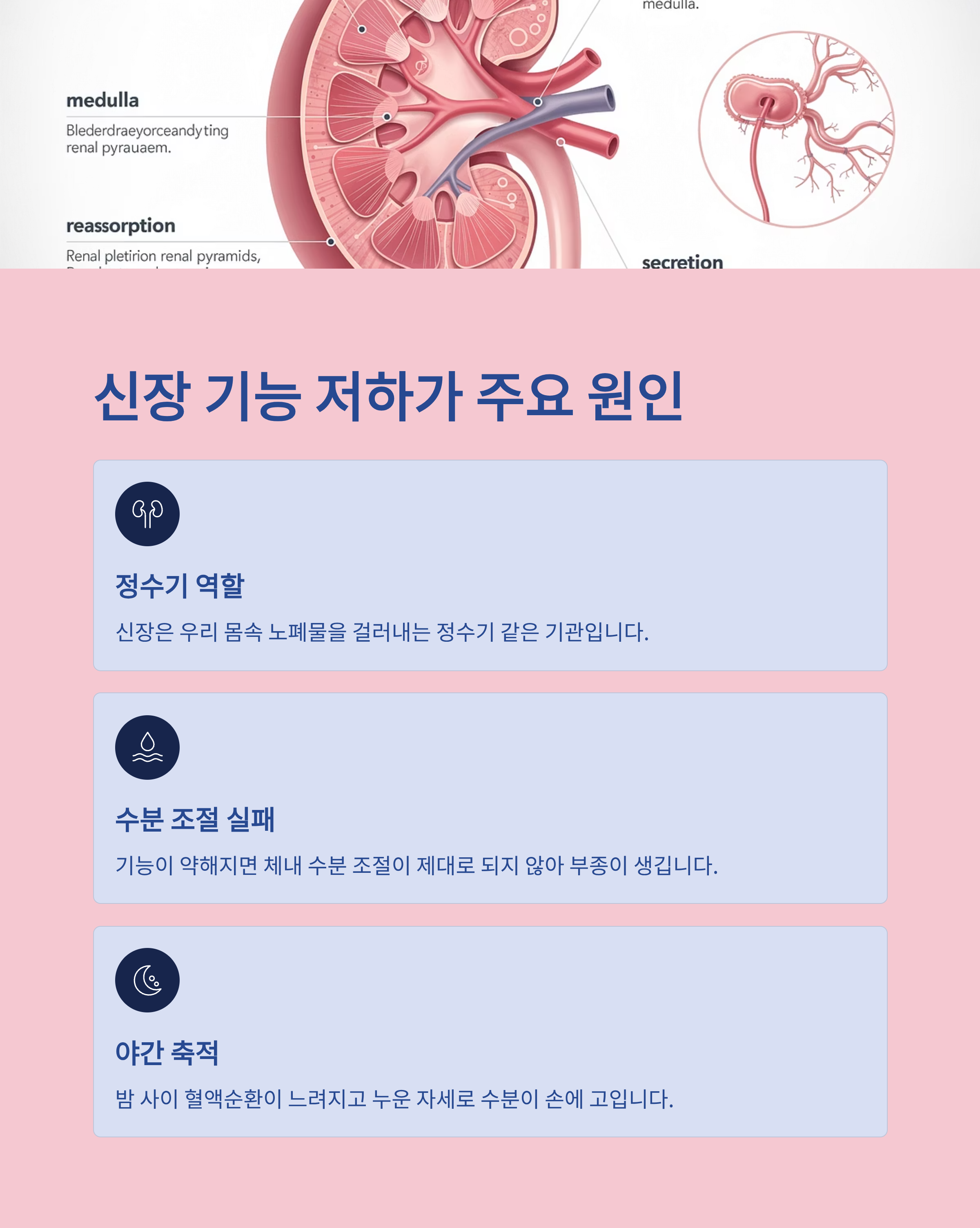 이 기능이 약해지면 체내 수분 조절이 제대로 되지 않아 부종이 생깁니다.