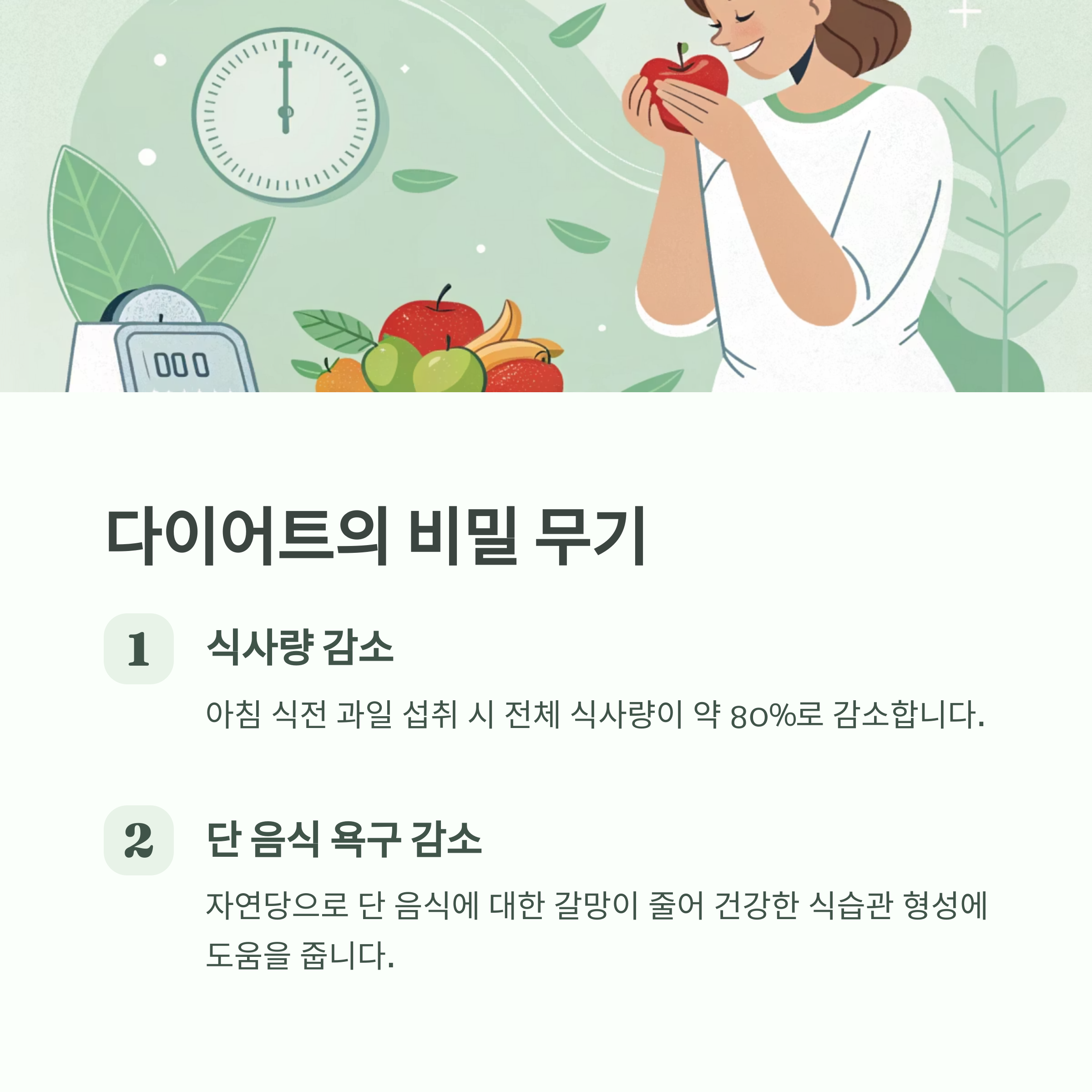 실제로 한 실험에서는 아침 식전 과일 섭취 시 전체 식사량이 약 80%로 감소했으며