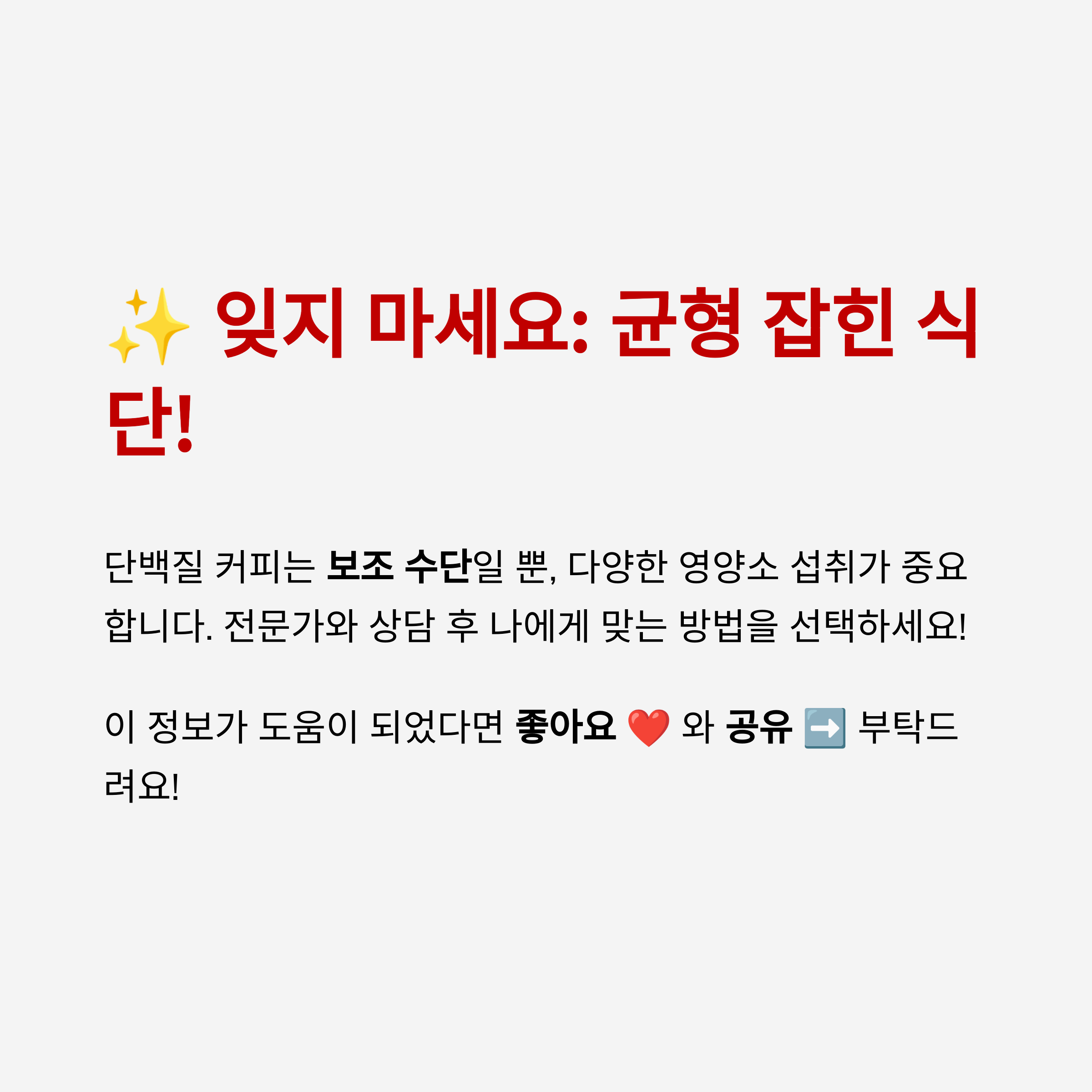 단백질 커피는 다이어트, 운동 보조, 아침 대용 등 다양한 목적으로 활용할 수 있는 음료입니다. 하지만 개인의 건강 상태에 따라 효과가 다를 수 있으므로, 본인의 라이프스타일과 식습관에 맞게 섭취하는 것이 중요합니다. 단백질 커피를 올바르게 활용하면 체중 관리와 건강 유지에 긍정적인 영향을 줄 수 있습니다.