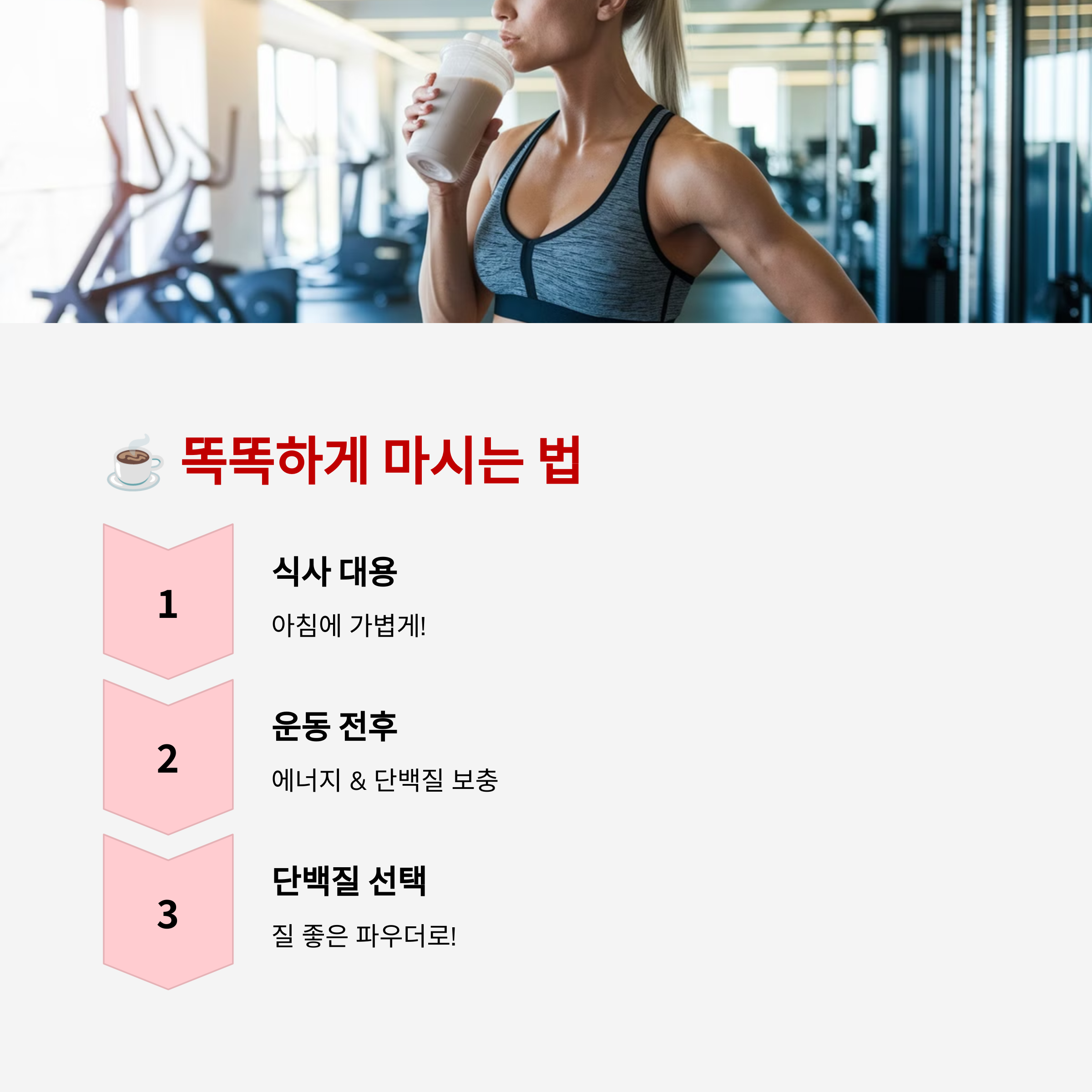 | 운동 후 단백질 쉐이크 대체 가능 | 불필요한 간식 섭취 감소 효과 | 운동 성과를 극대화할 수 있음 |
