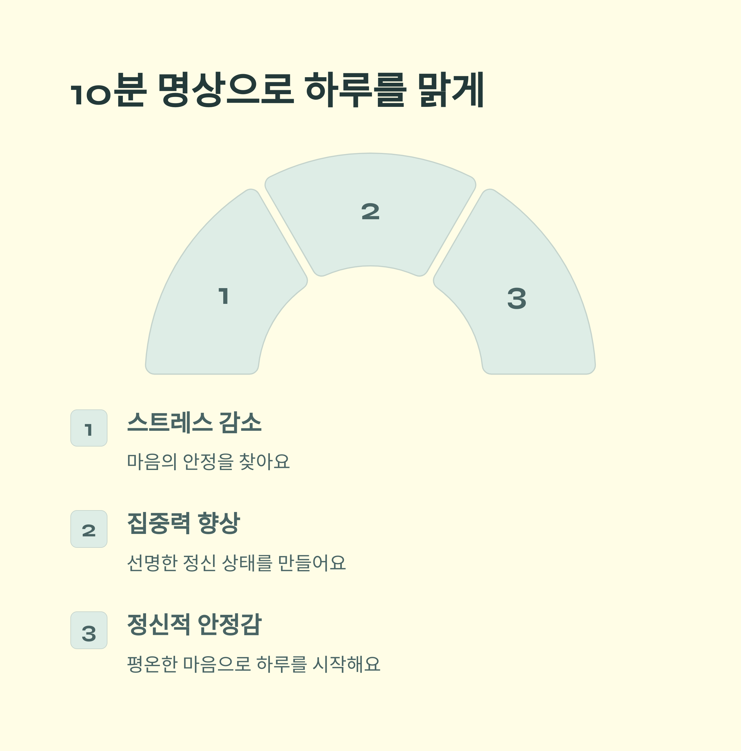 아침에 명상을 하면 하루 종일 더 차분하고 집중력 있는 상태를 유지할 수 있습니다. 명상은 스트레스를 줄이고, 부정적인 감정을 조절하며, 정신적인 안정을 유지하는 데 도움을 줍니다. 하루 5~10분만이라도 조용한 공간에서 깊이 호흡하고 현재에 집중해 보세요.