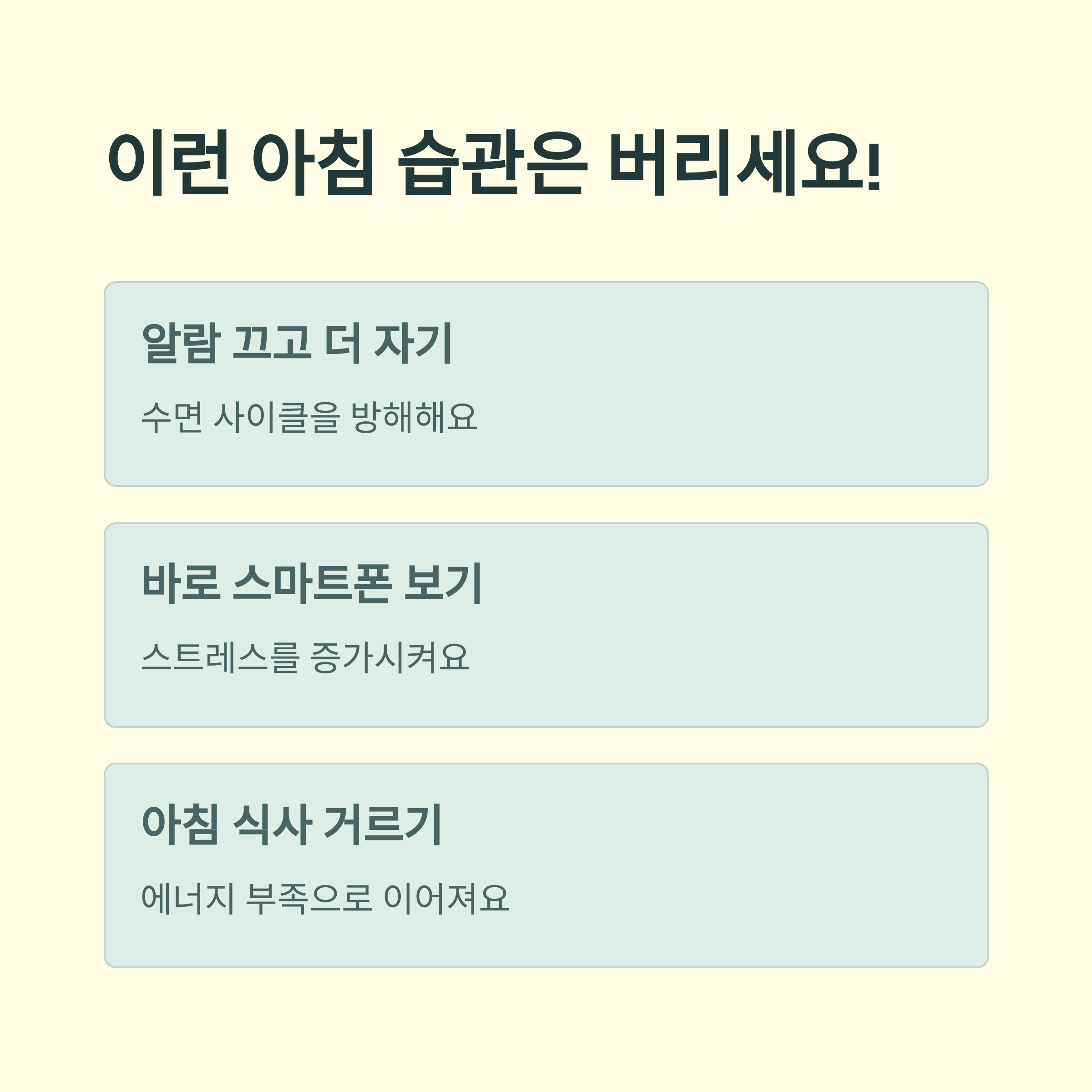 건강한 아침 습관을 기르는 것만큼이나 나쁜 습관을 피하는 것도 중요합니다. 특히 아침에 다음과 같은 행동을 반복하면 건강에 악영향을 미칠 수 있습니다.