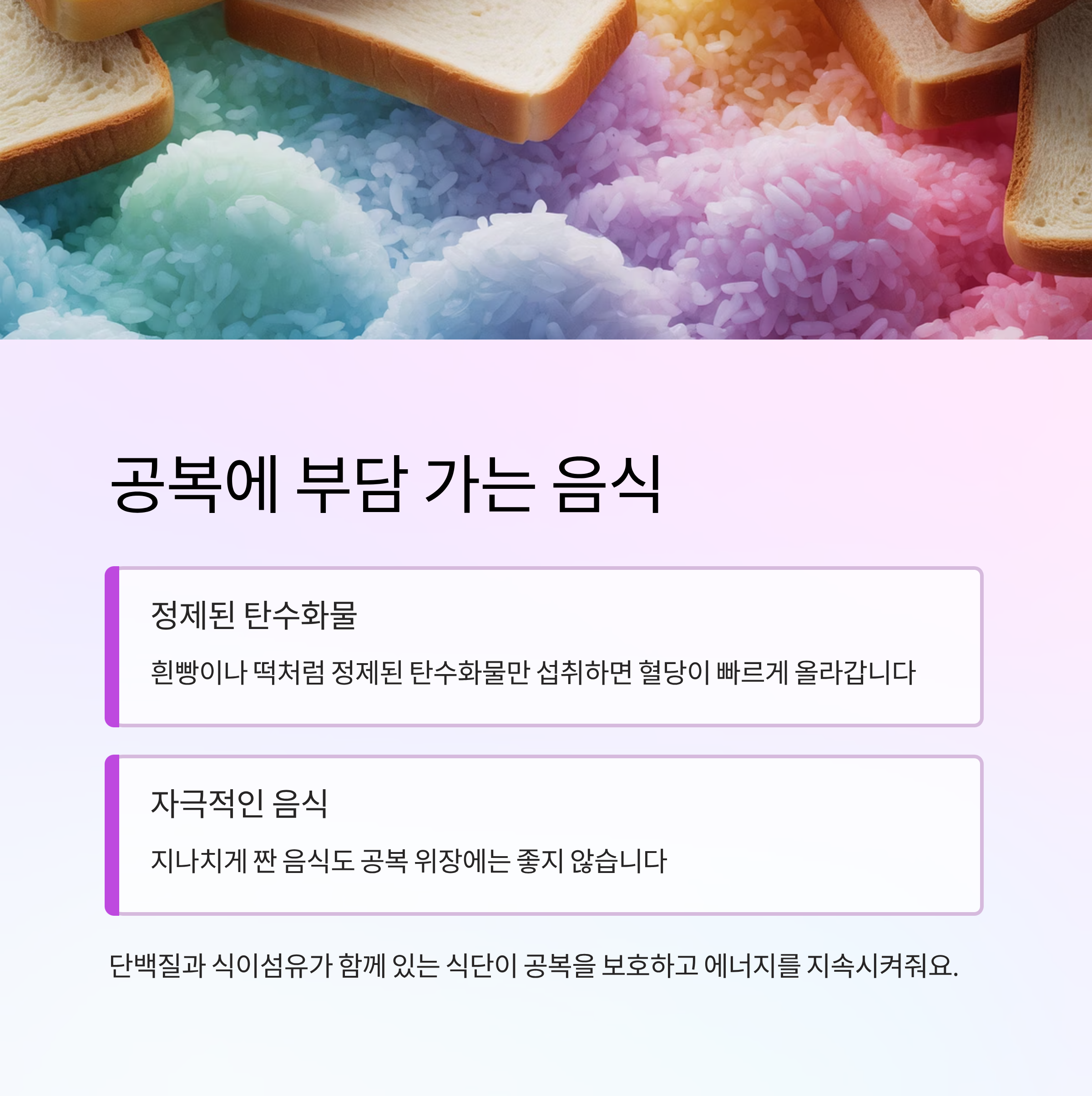 이보다는 단백질과 식이섬유가 함께 있는 식단이 공복을 보호하고 에너지를 지속시켜줘요.
