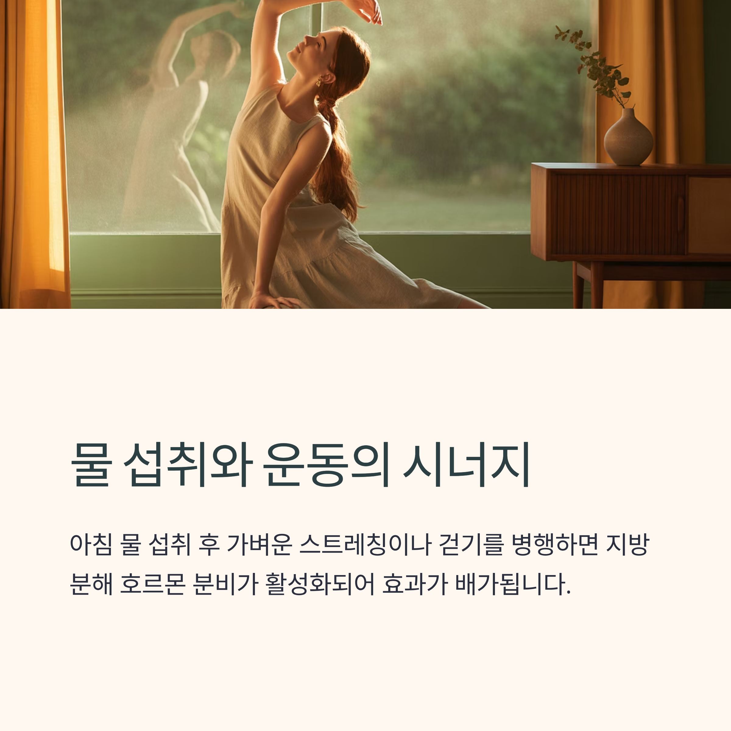 아침 물 섭취 후 가벼운 스트레칭이나 걷기를 병행하면 지방 분해 호르몬 분비가