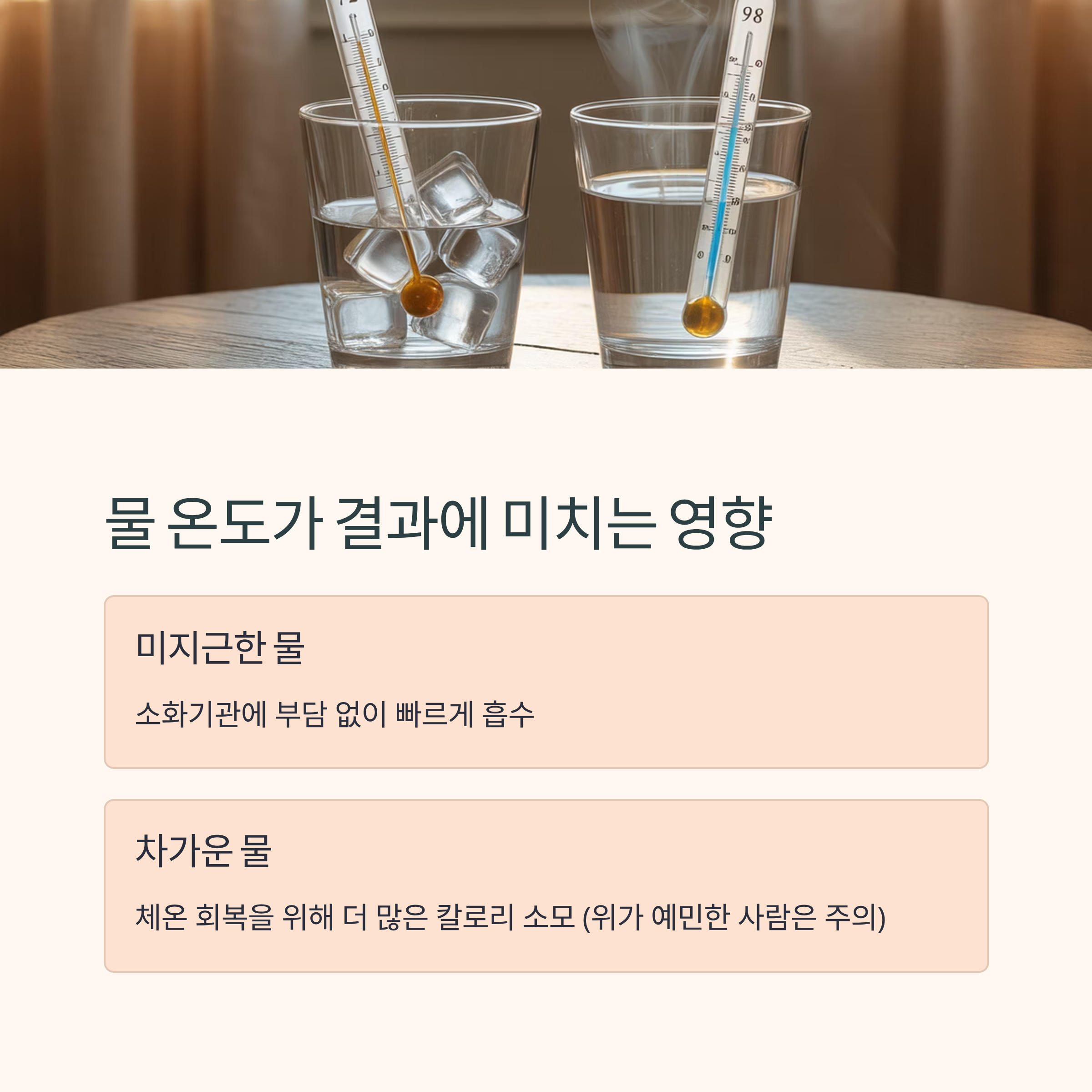 미지근한 물은 소화기관에 부담을 주지 않고 빠르게 흡수됩니다. 반면 약간 차가운
