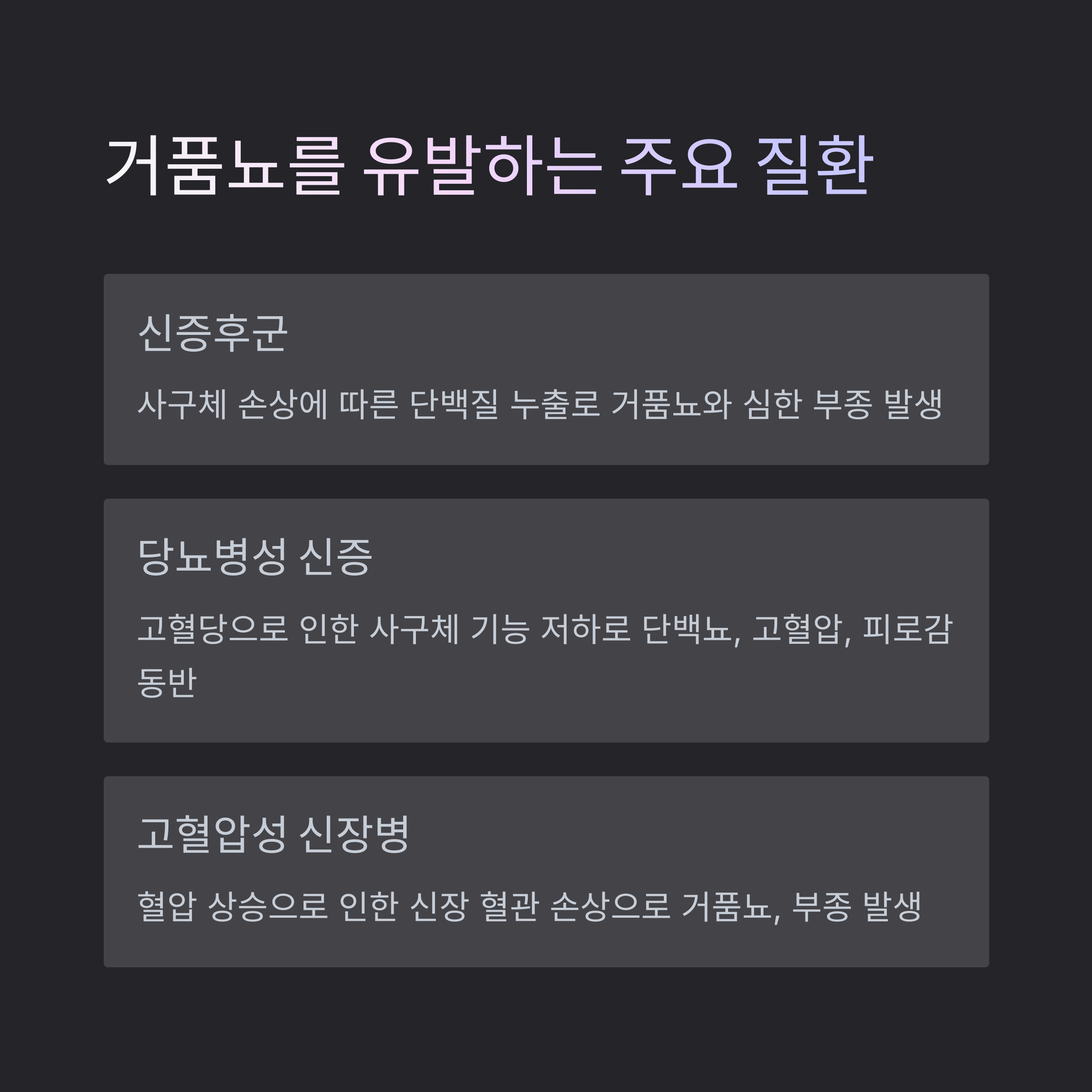 | 고혈압성 신장병 | 혈압 상승으로 인한 신장 혈관 손상 | 거품뇨, 고혈압, 부종 |